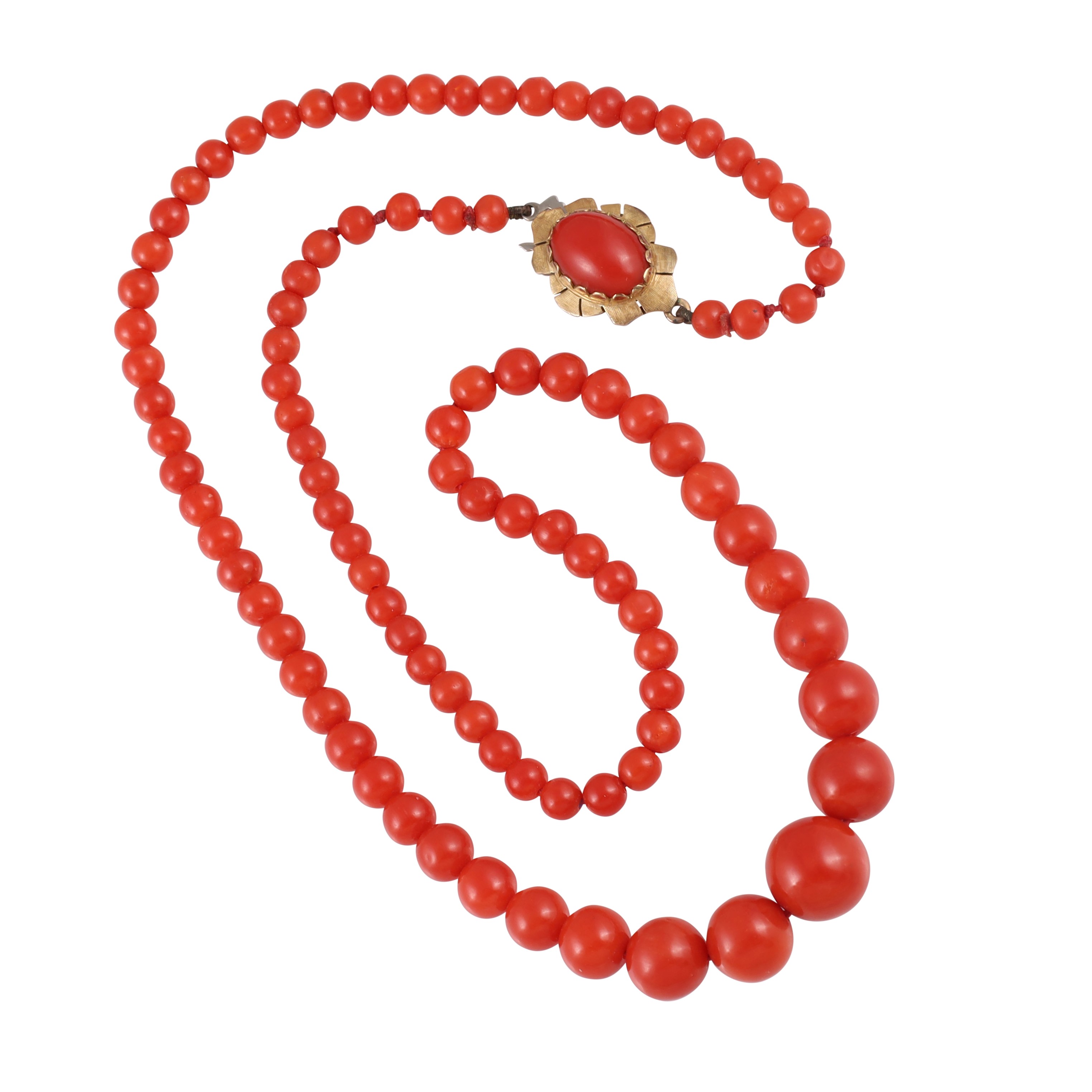 a un filo di sfere di corallo poste in gradazione 11,5 / 4,5 mm. Chiusura in oro giallo sagomata con corallo ovale taglio cabochon, gr. 30.