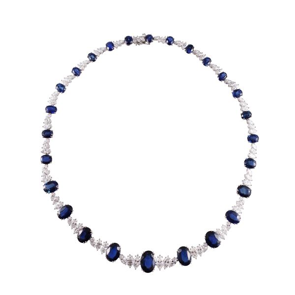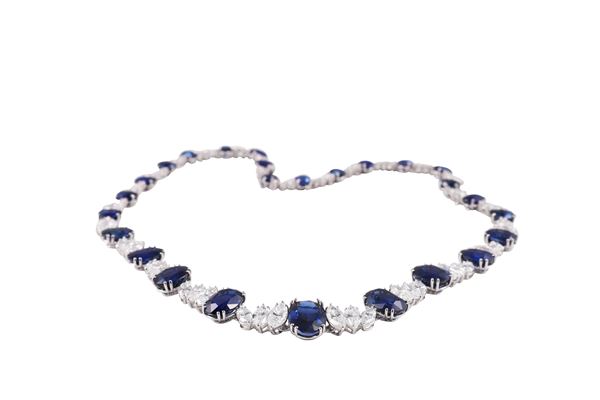 in platino, interamente percorsa da zaffiri ovali posti in gradazione del peso complessivo di 50 ct ca., inframezzati da diamanti taglio navette del peso complessivo di 19 ct ca., gr. 46,4. Corredata da custodia.