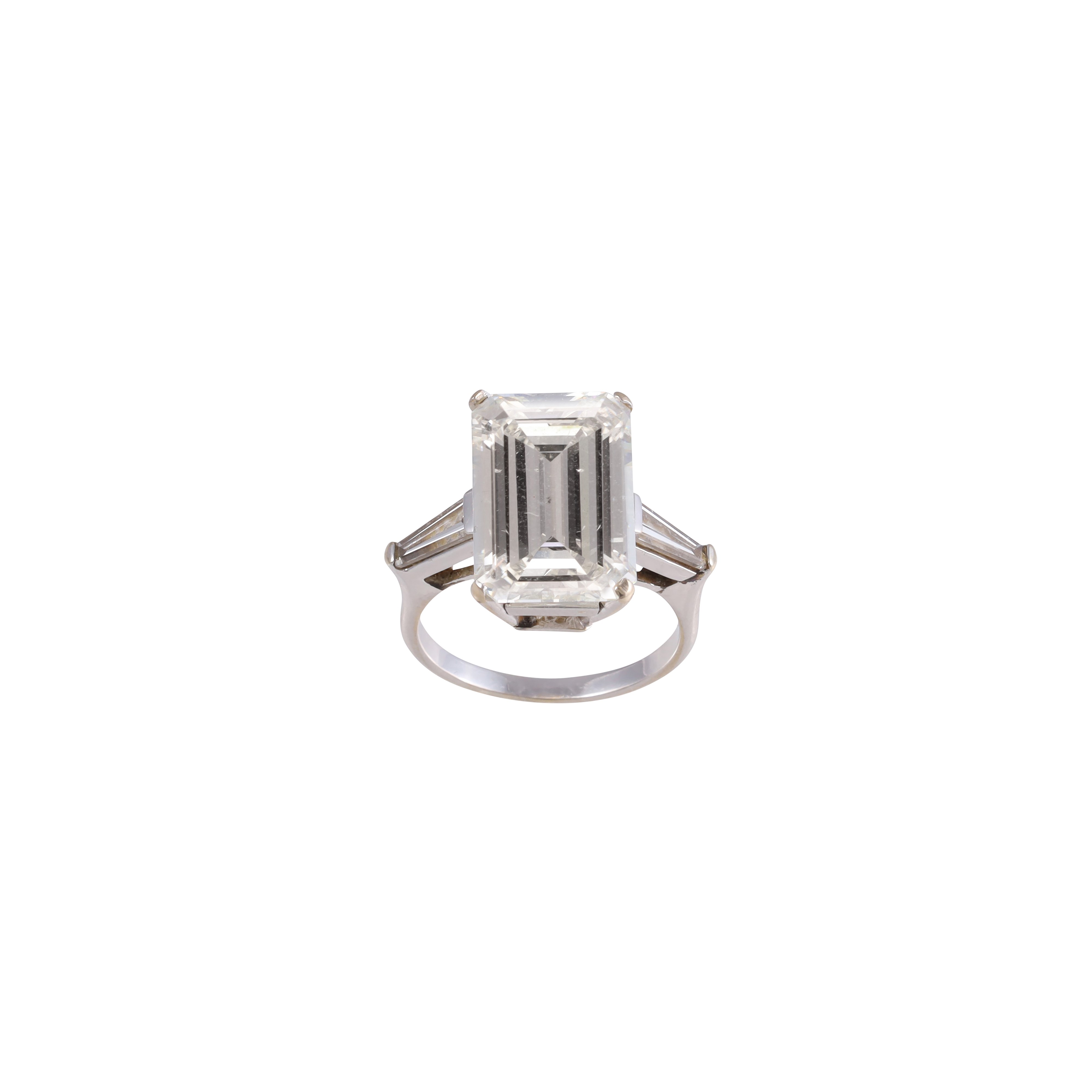 a forma rettangolare con angoli tronchi del peso di 9,14 ct, montatura in oro bianco con diamanti tapered laterali, gr. 4,3.