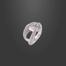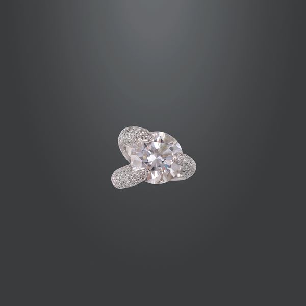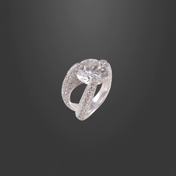taglio a brillante del peso di 10,04 ct, posto alla sommità di un anello dal design scultoreo realizzato in oro bianco, interamente impreziosito da brillanti in pavé del peso complessivo di 4,50 ct ca., gr. 20,5.