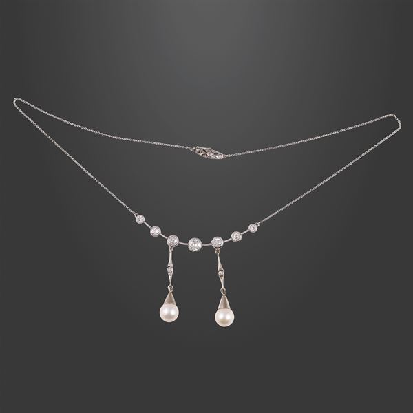 in platino e oro con anteriore impreziosita da diamanti taglio antico europeo disposti in linea a scalare del peso complessivo di 1,70 ct ca. a sostegno di due pendenti ciascuno con perla coltivata terminale 9 mm., gr. complessivi 12,4.