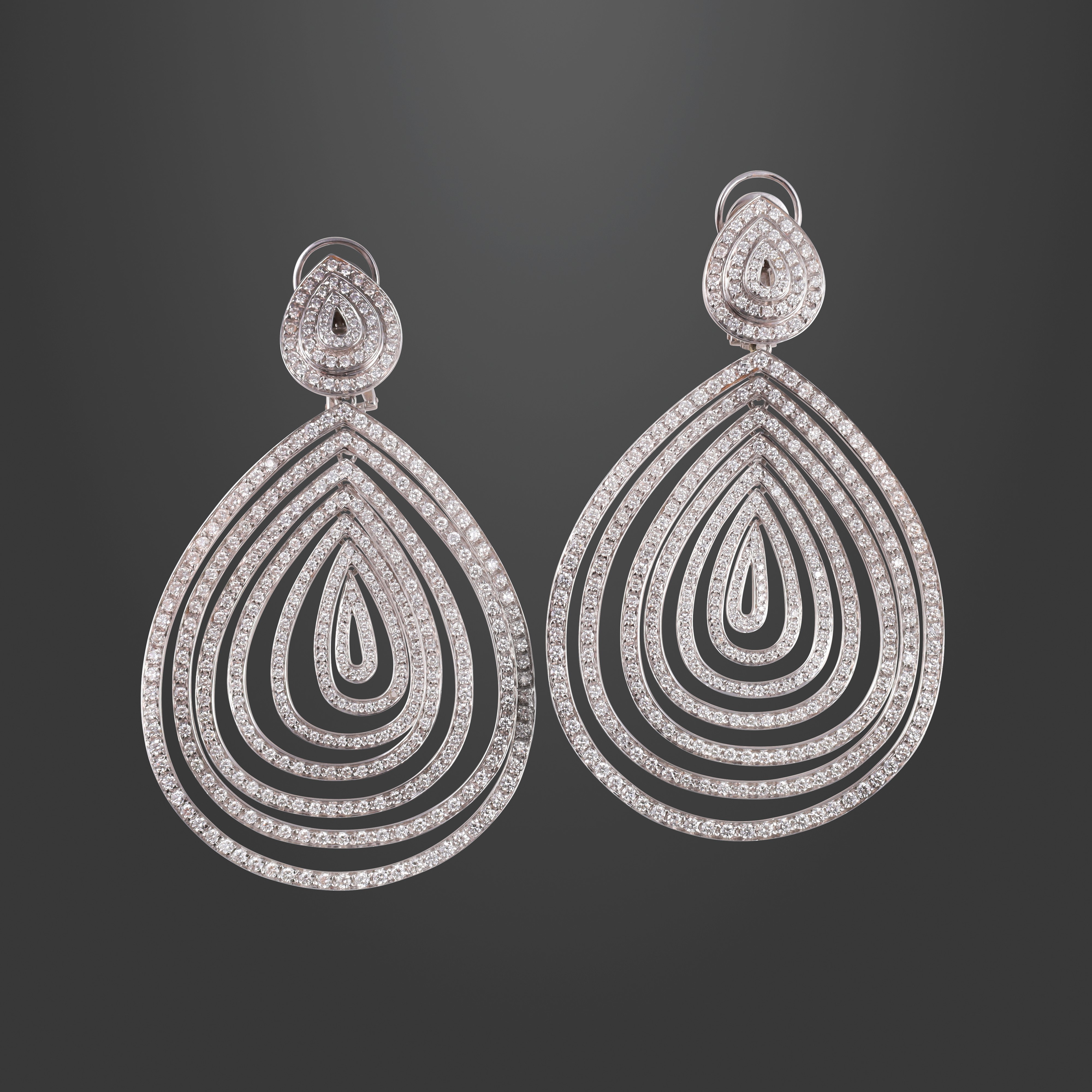 lunghi pendenti, in oro bianco composti da motivi a goccia concentrici con brillanti del peso complessivo di 13 ct ca., gr. 45,4.