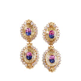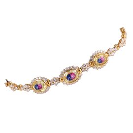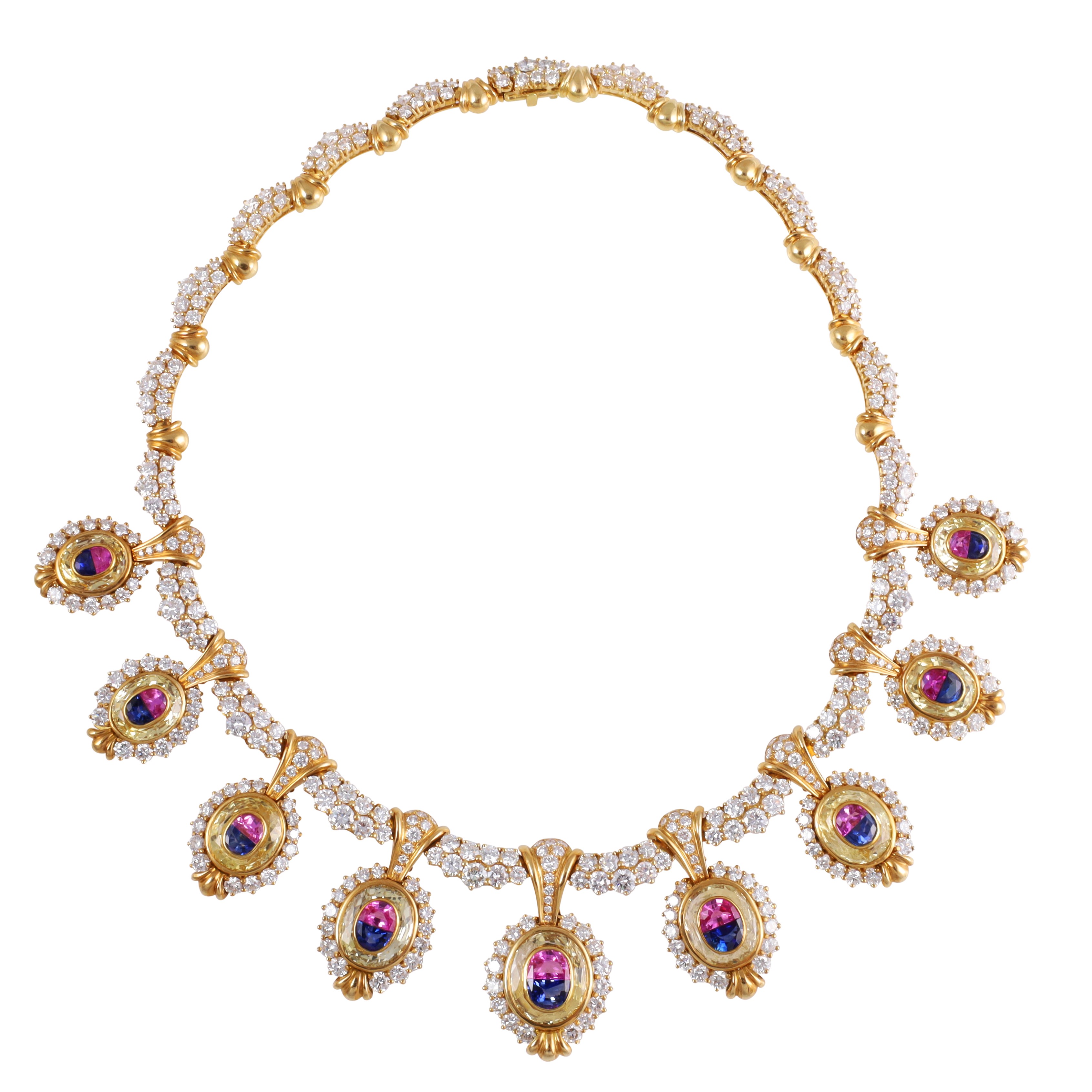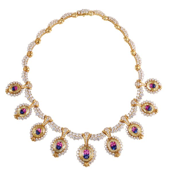composta da girocollo, bracciale, orecchini e anello realizzati in oro giallo con brillanti, ornati da motivi ovali, ciascuno impreziosito da uno zaffiro e un corindone rosa semiovali, incastonati specularmente al centro di un corindone giallo sfaccettato, gr. complessivi 208,4. Diamanti taglio brillante del peso complessivo di 37 ct ca.