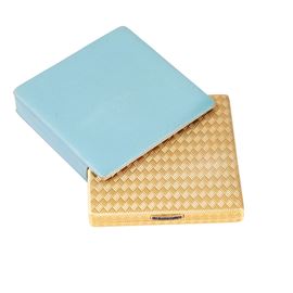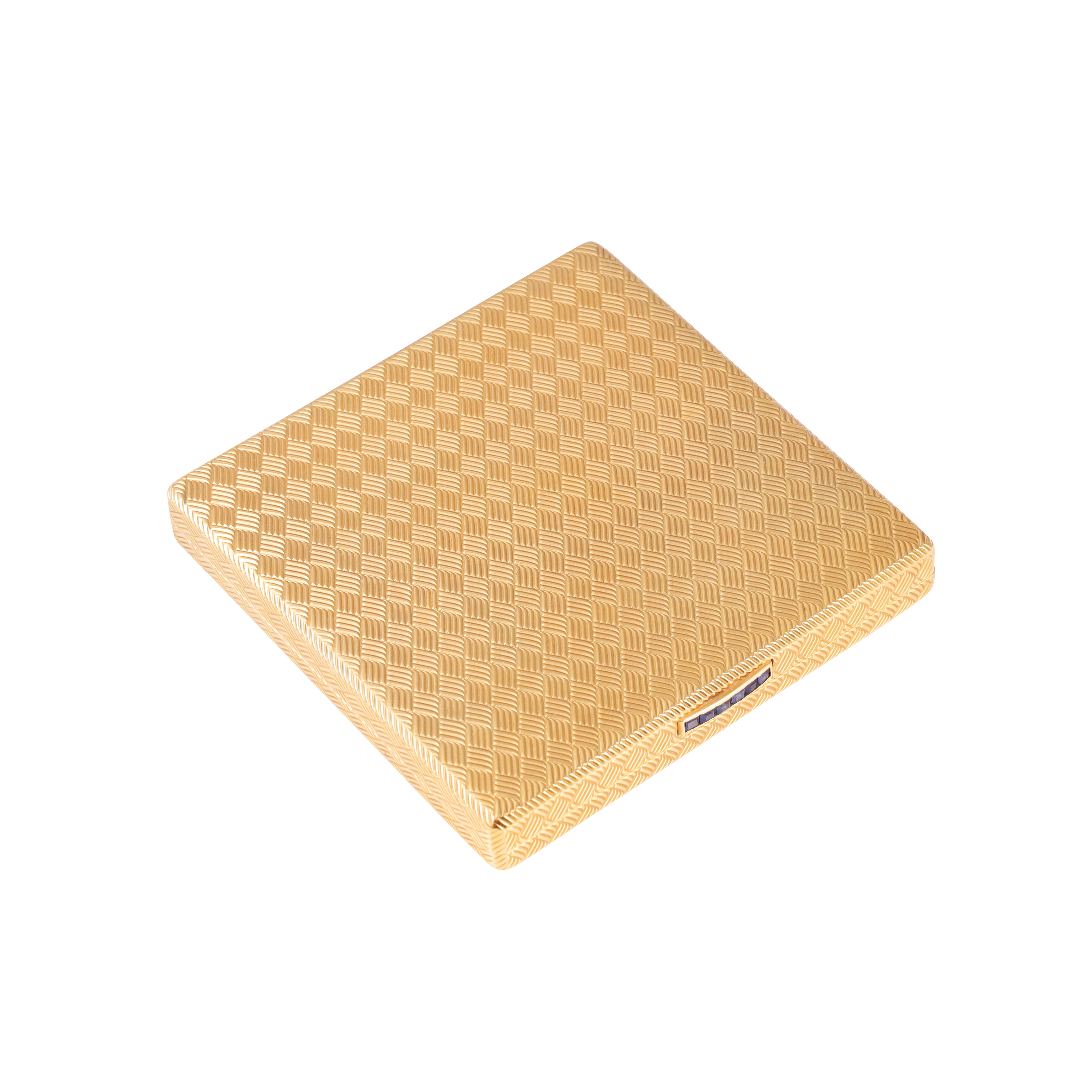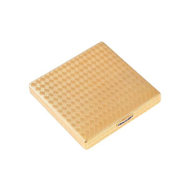 in oro giallo a corpo rettangolare con decoro geometrico e pulsante di apertura ornato da zaffiri taglio carré (privo di specchio), gr. 124,3. Corredato da custodia.