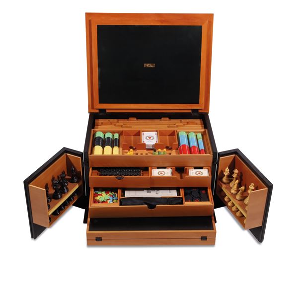scatola da gioco in legno di pero con particolari in oro realizzata dall'ebanista Pierluigi Ghianda per Pomellato (mancanze). Corredata da volume "La scatola dei giochi" di Gianpaolo Dossena.