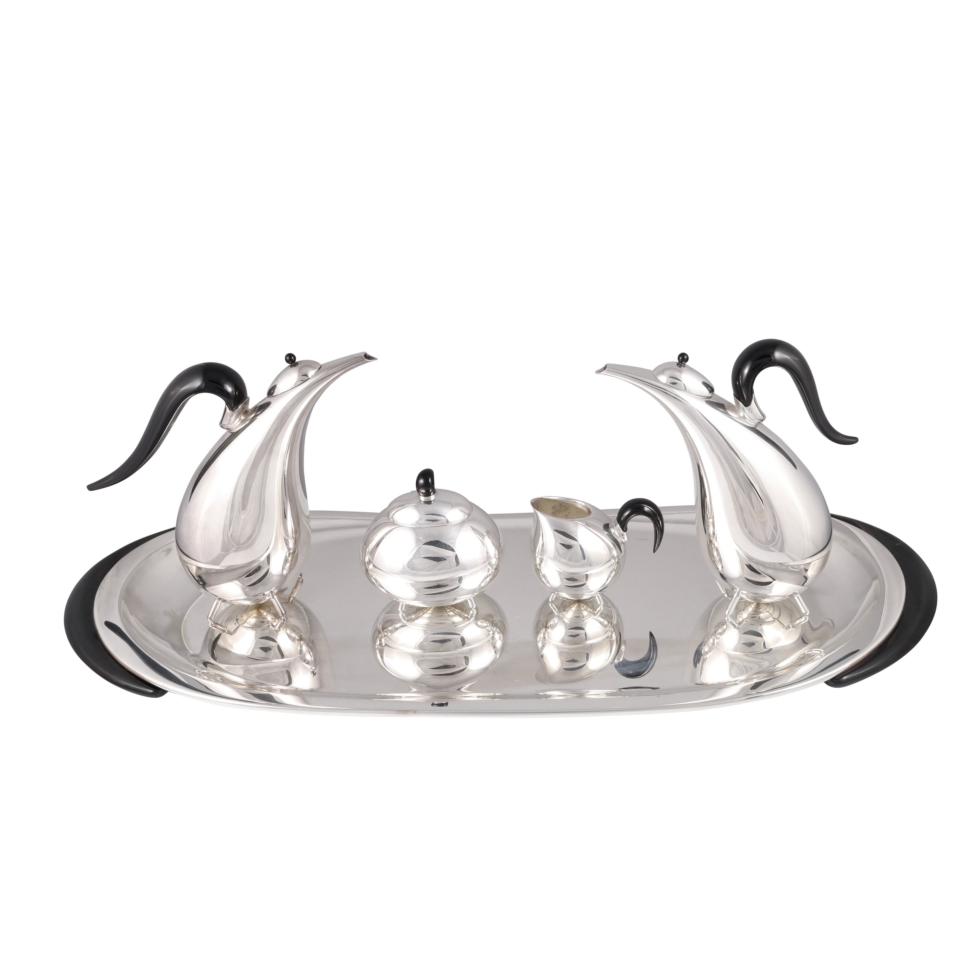 in argento 925/1000 a corpi espansi lucidi con prese e pomoli in bachelite nera. Il set è composto da vassoio ovale, due teiere, zuccheriera e lattiera, gr. lordi complessivi 3.240 ca.
