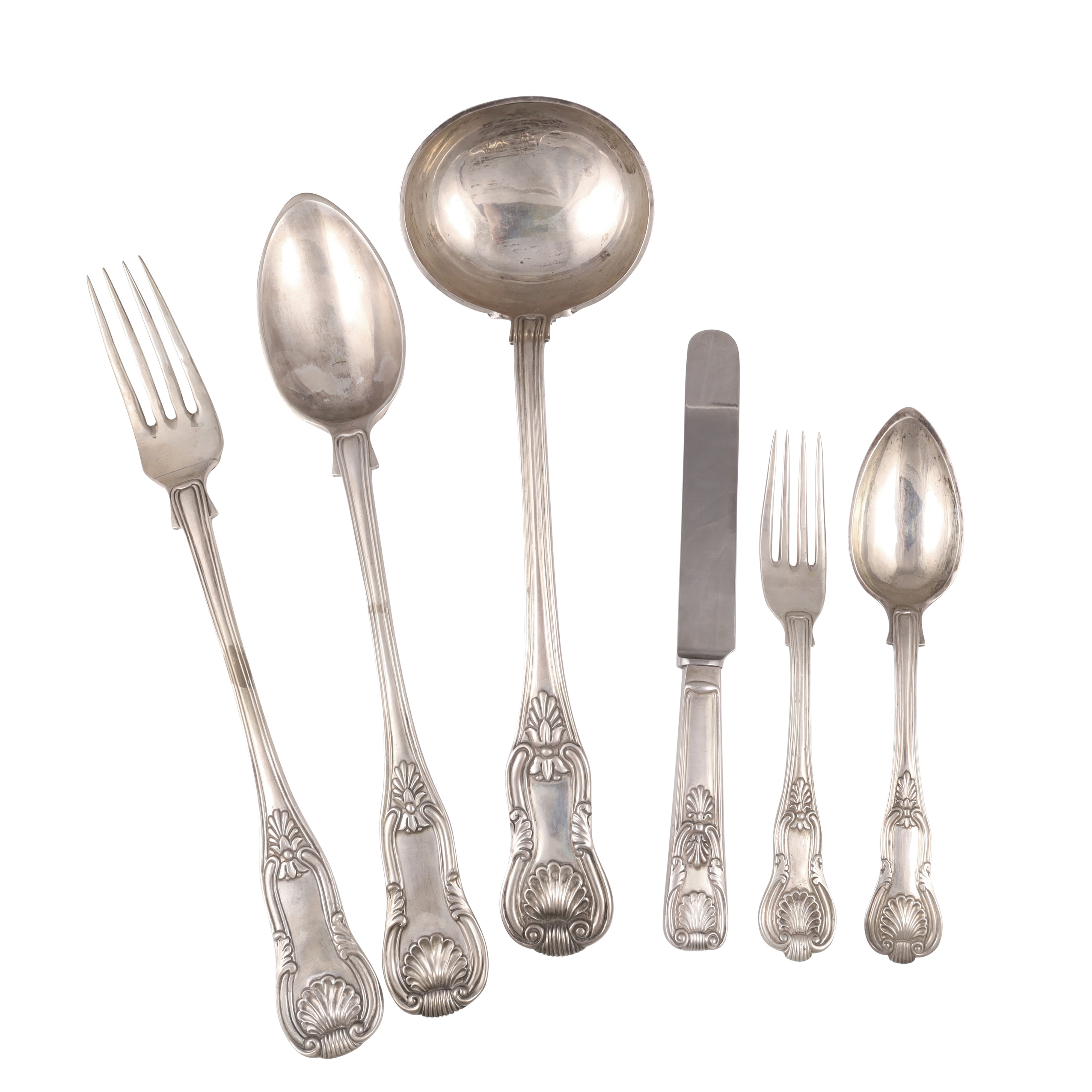 in argento, composto da 59 pezzi, manici di linea sagomata con bordo leggermente bombato, riccamente decorati sia al fronte che al verso con motivi in rilievo a guisa di conchiglie e volute fogliate, gr. complessivi 4.800 ca. (esclusi pezzi con parti in metallo).