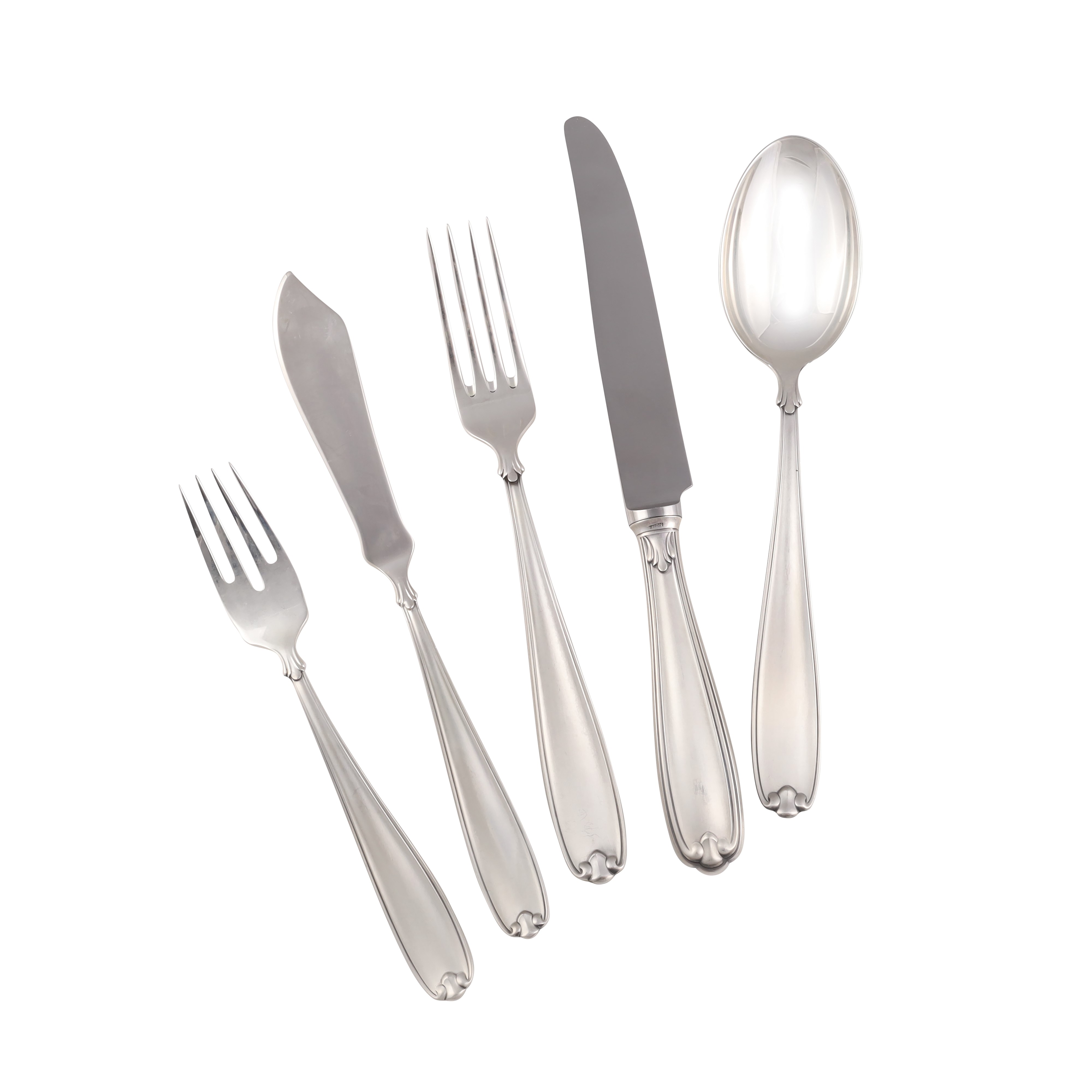 in argento 925/1000, composto da 191 pezzi, manici satinati con decori a volute e parti funzionali lucide, gr. complessivi 9.600 ca. (esclusi pezzi con parti in metallo). Corredati da custodie in panno.