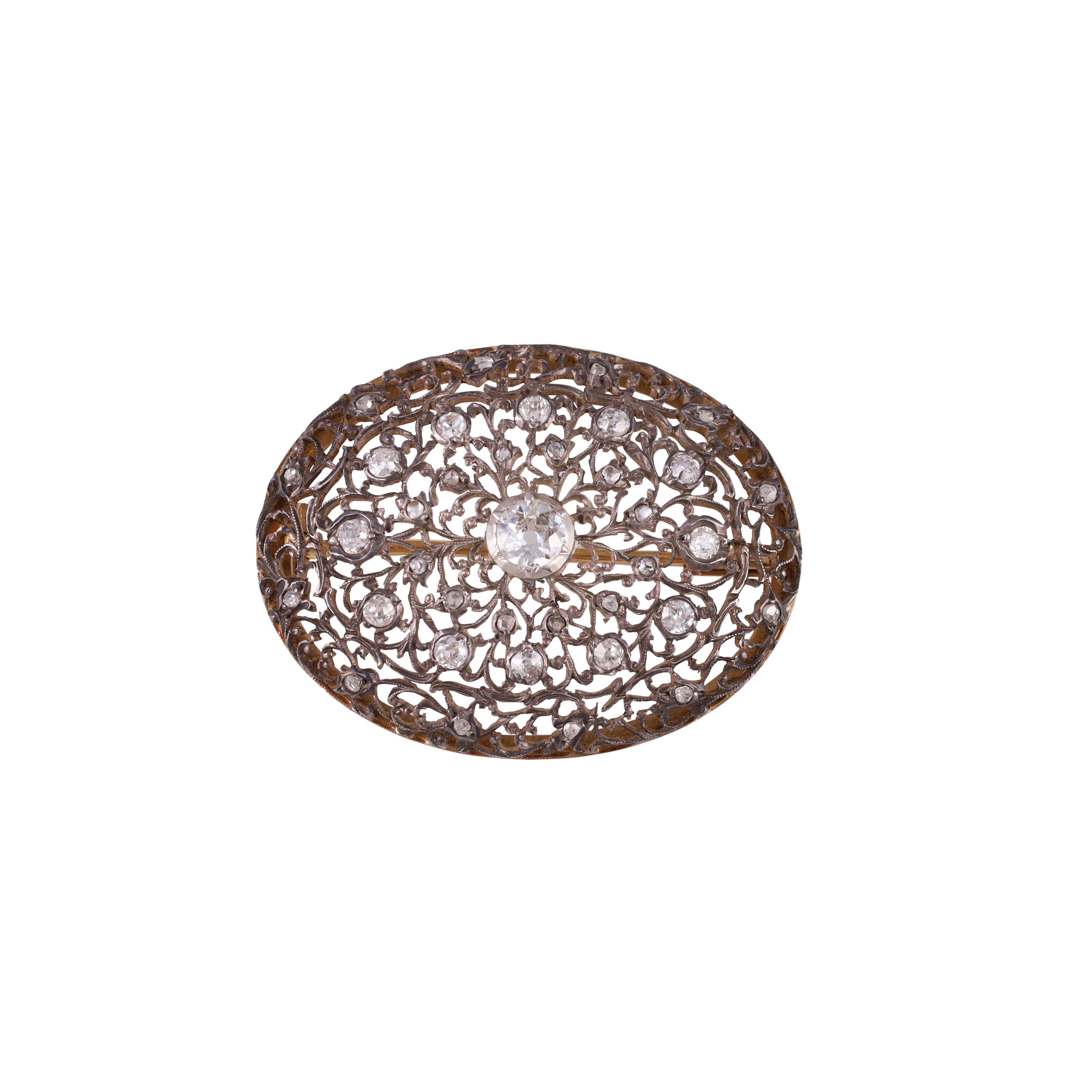 a forma ovale in oro e argento finemente traforata, ornata da diamanti taglio antico europeo di cui uno di dimensioni maggiori posto al centro, gr. 9,2. Corredata da custodia.