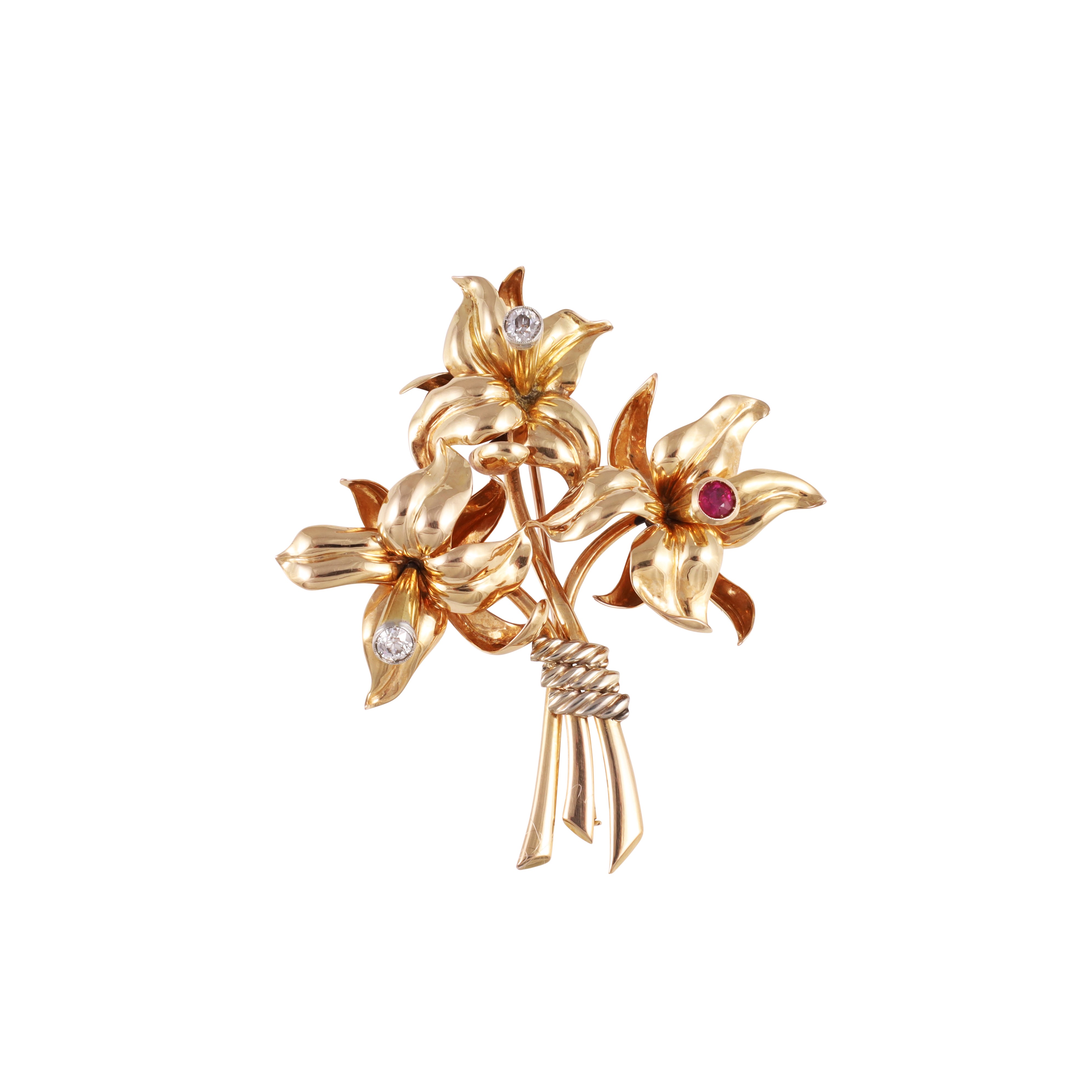 raffigurante un bouquet a tre fiori, realizzata in oro giallo e bianco, ornata da rubino e diamanti taglio antico europeo, gr. 18,7. Corredata da custodia.