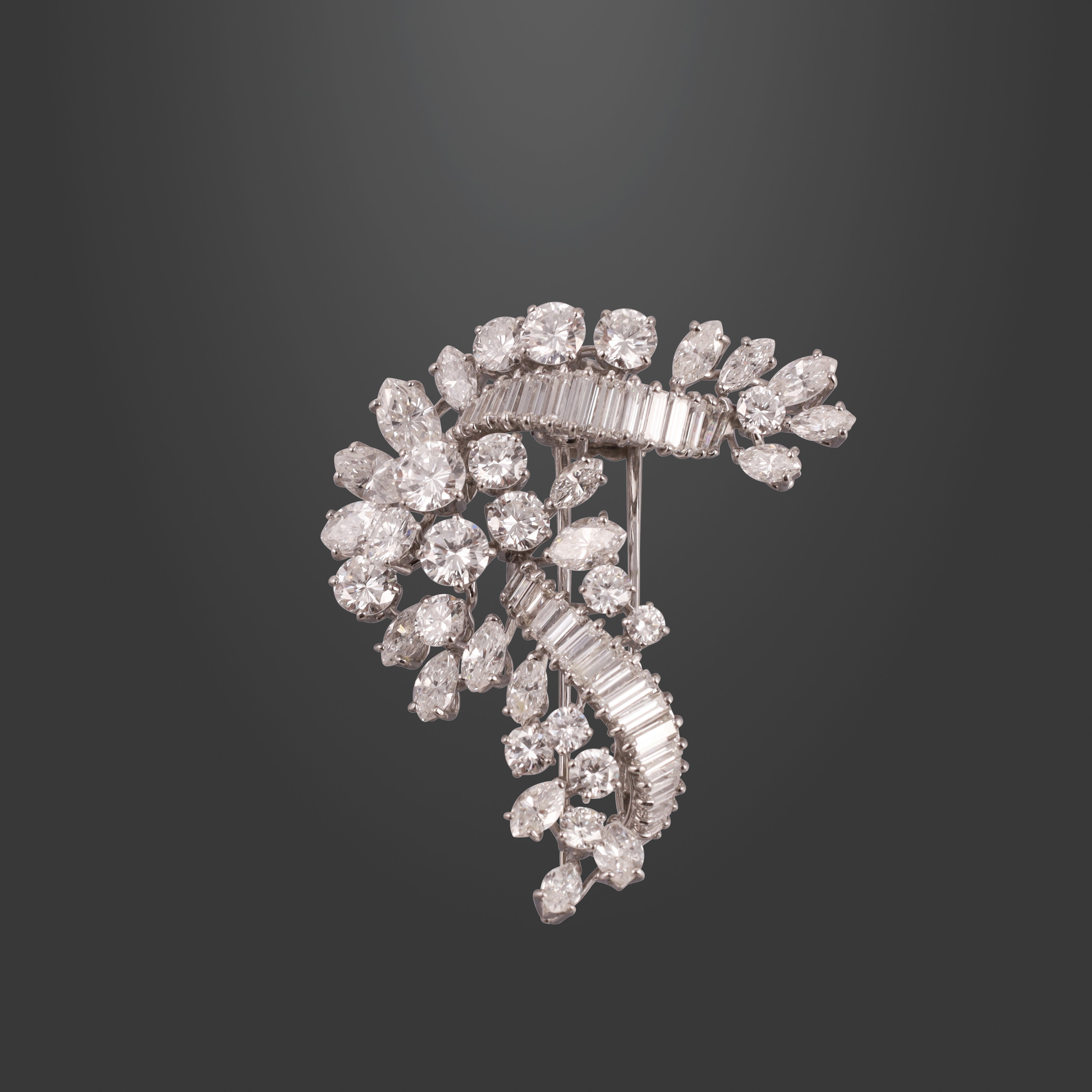 in platino d'ispirazione vegetale impreziosita da brillanti, diamanti a goccia e taglio baguette del peso complessivo di 6,50 ct ca., gr. 13,9.