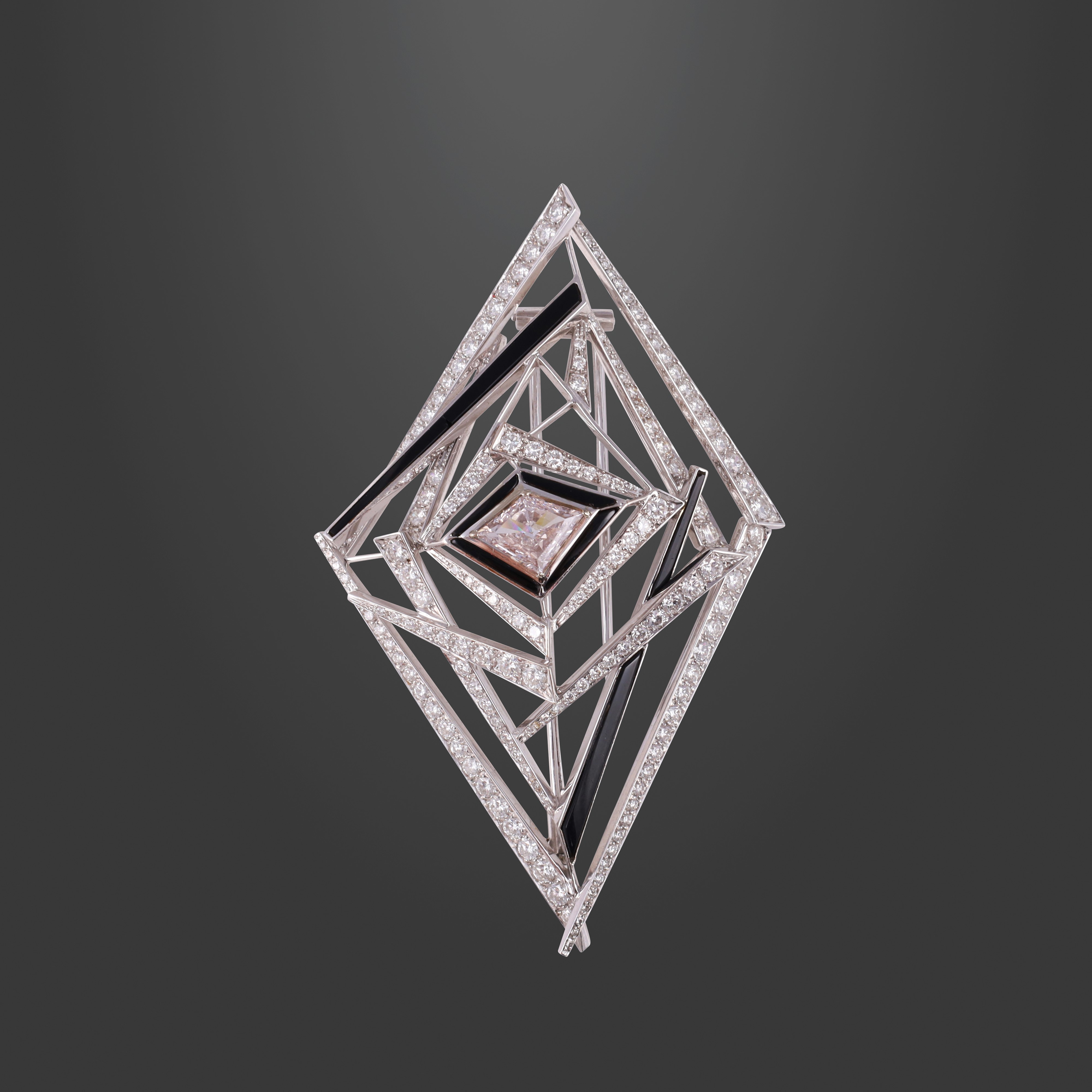 in oro bianco a forma geometrica, evidenziata al centro da un diamante rosa a forma romboidale del peso di 1,58 ct, impreziosita da brillanti del peso complessivo di 4 ct ca. e onici, gr. 27,1.