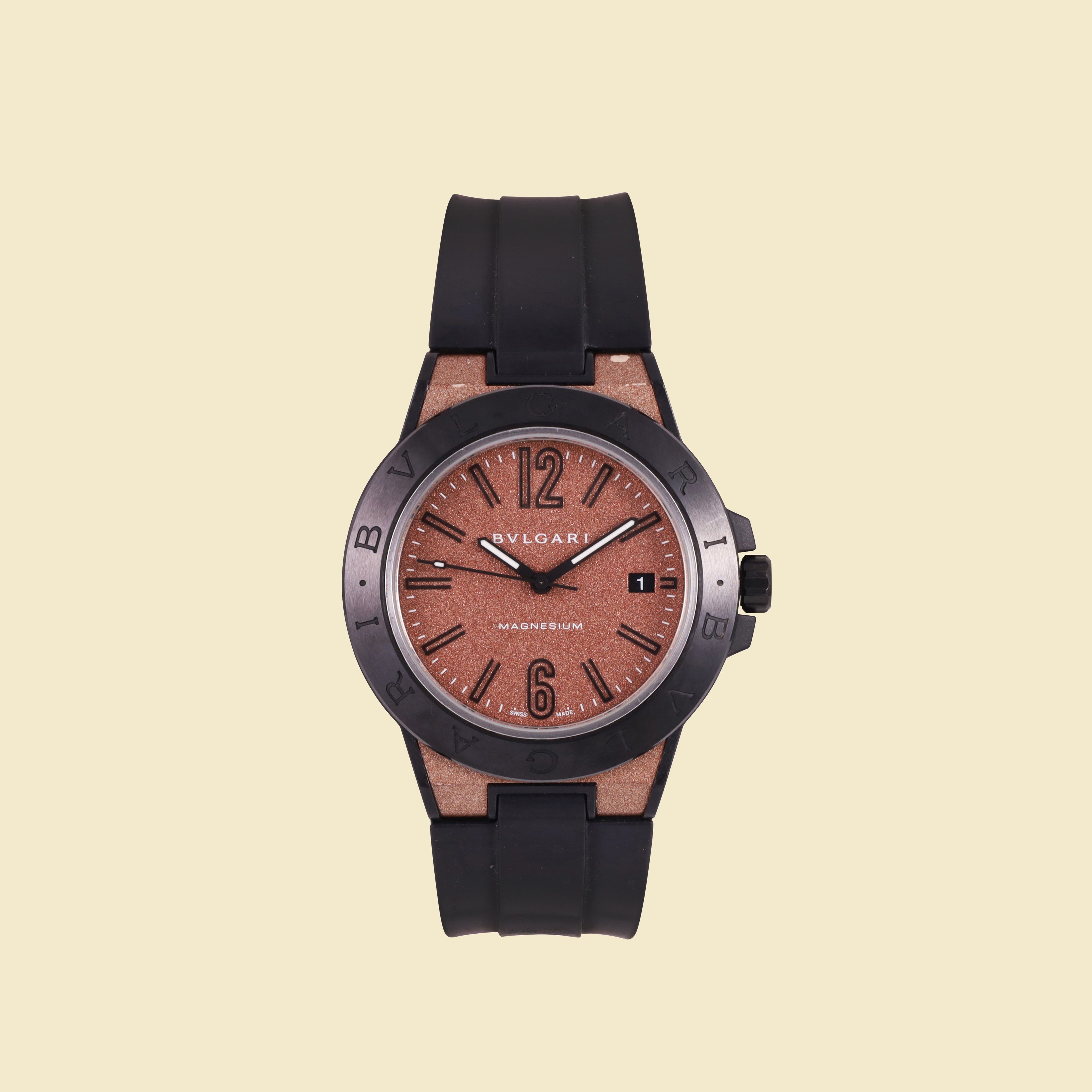 Cassa: in magnesio, resina Peek e lunetta in ceramica con l'iconico doppio logo Bvlgari. Fondello a vite