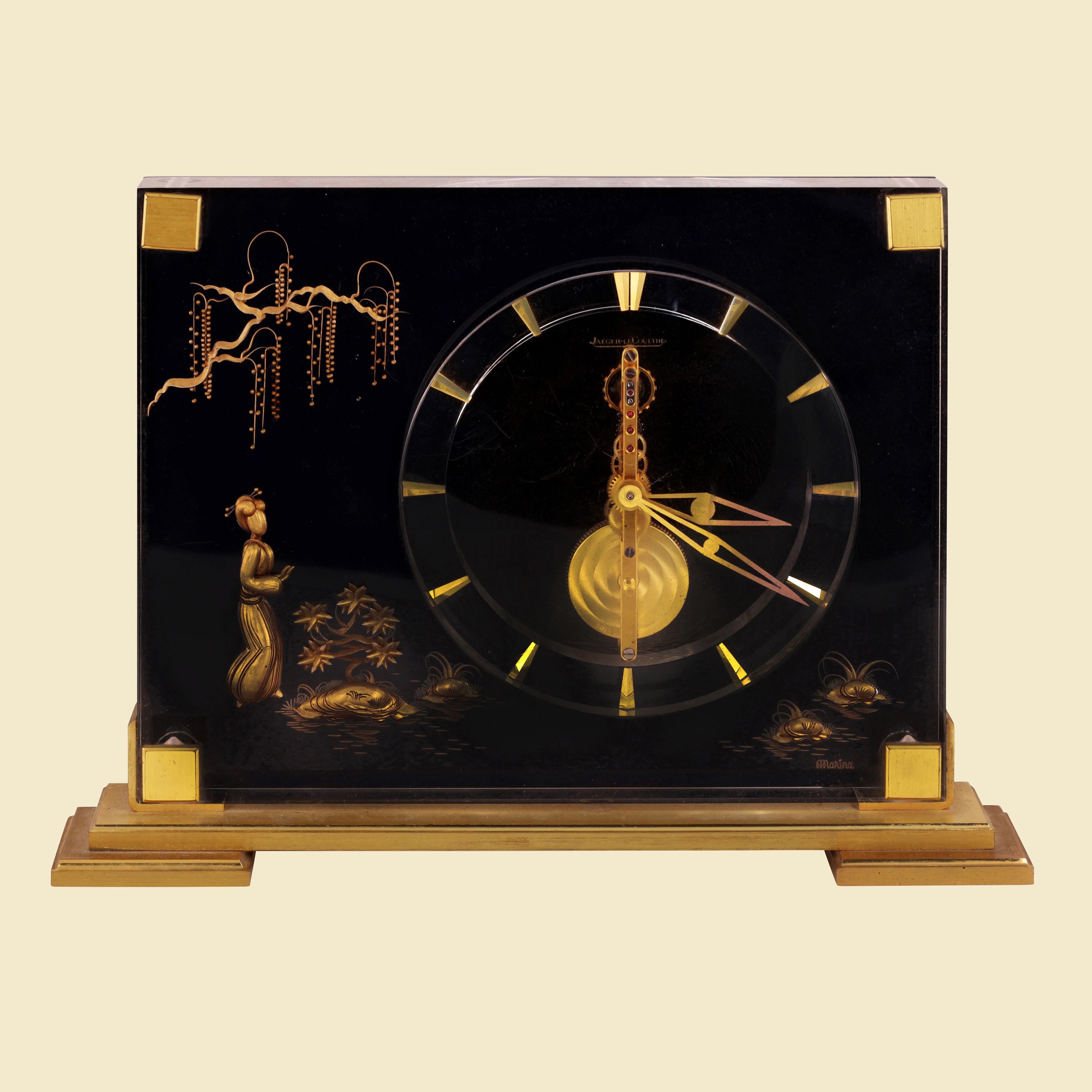 Cassa in metallo dorato, rettangolare, in plexiglas, sfondo nero con inserti dorati raffiguranti una donna sotto un glicine vicino a uno stagno di ninfee