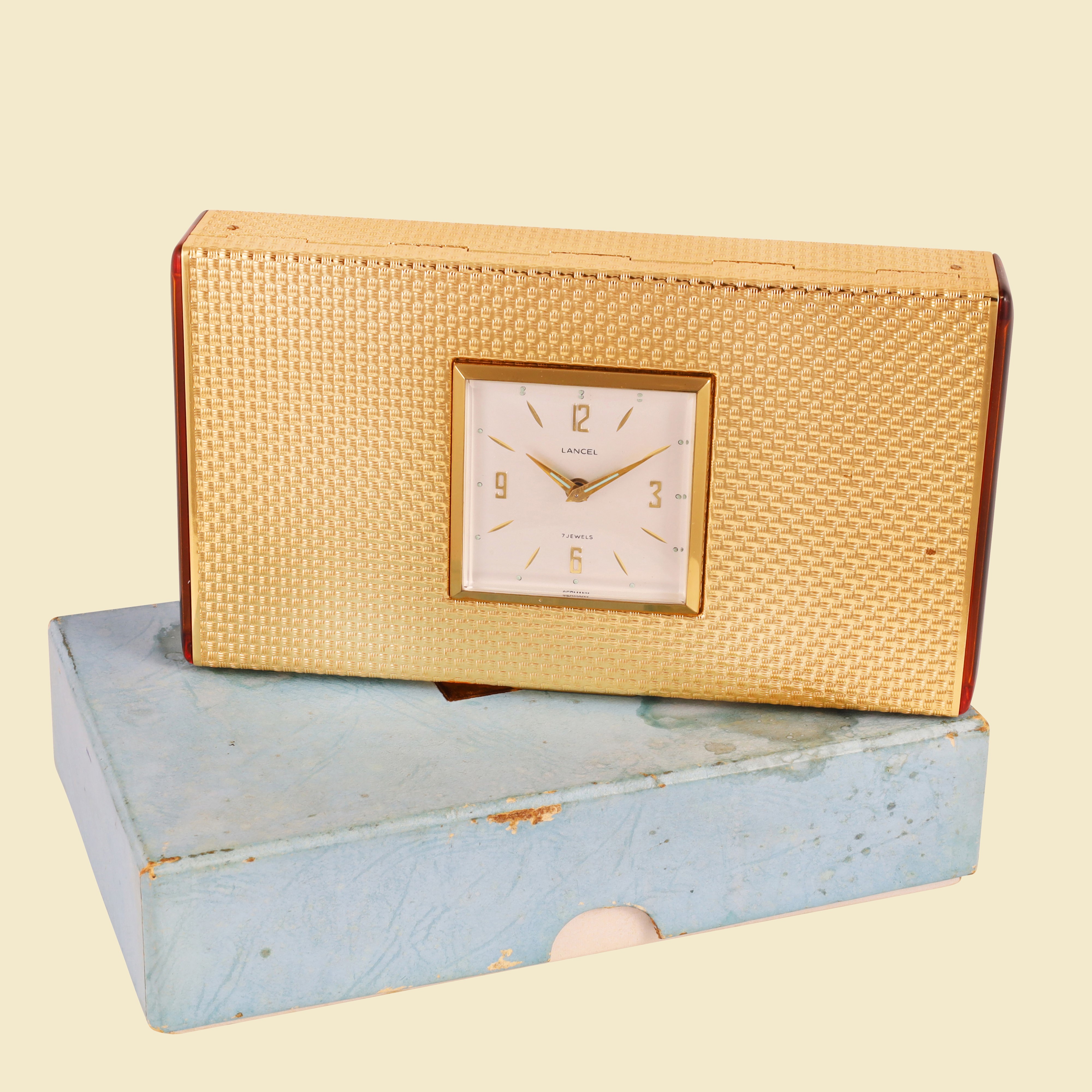 In metallo dorato e simil tartaruga, con orologio/sveglia a carica manuale al centro