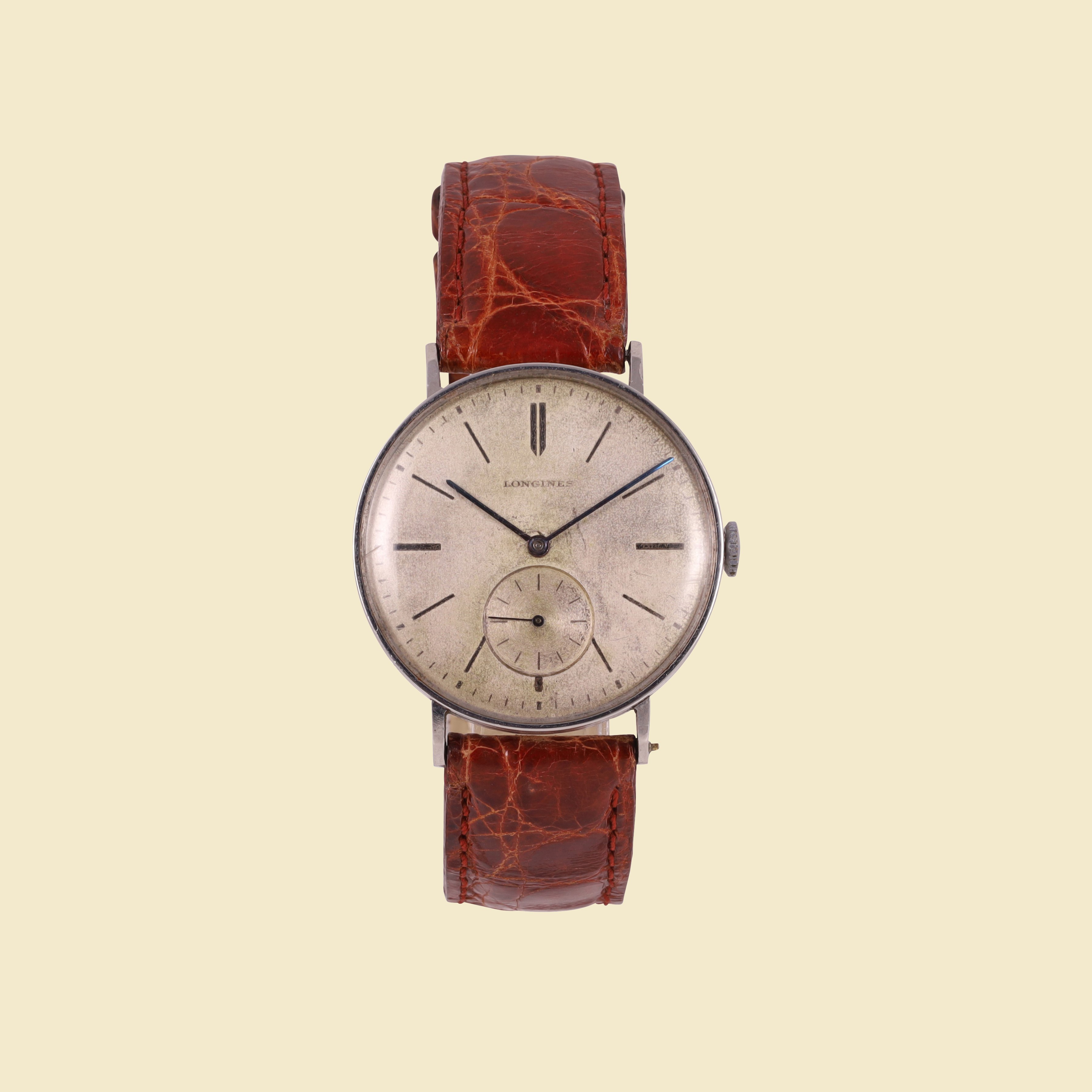 Quadrante patinato, indici a bastone, secondi a ore 6. Sfere a bastone