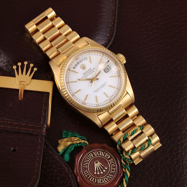 Quadrante: Smalto bianco, indici a bastone, apertura giorno/data. Sfere a bastone