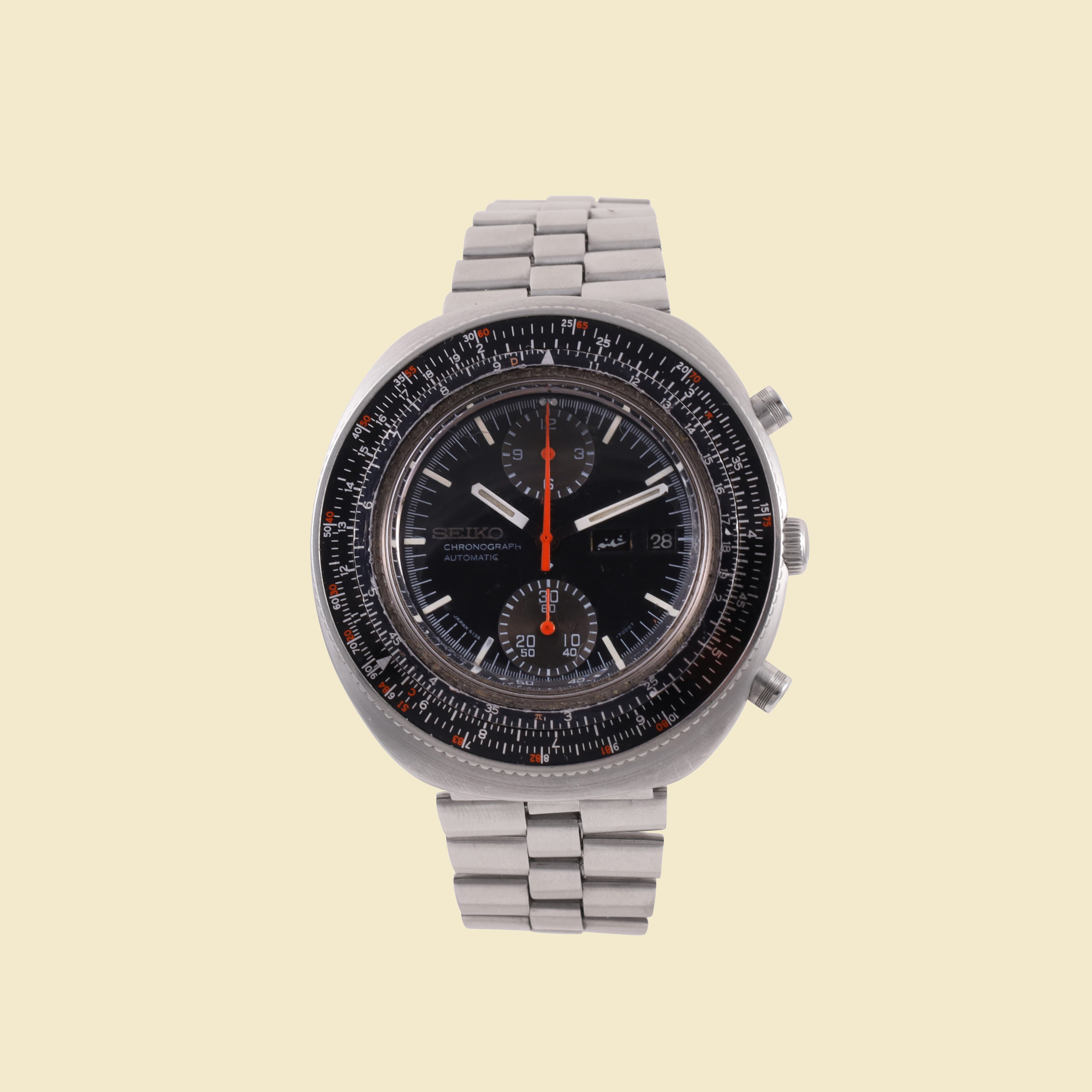 Quadrante: nero, indici a bastone, giorno/data (arabo-inglese, contatore per 30 minuti e 12 ore. Sfere a bastone