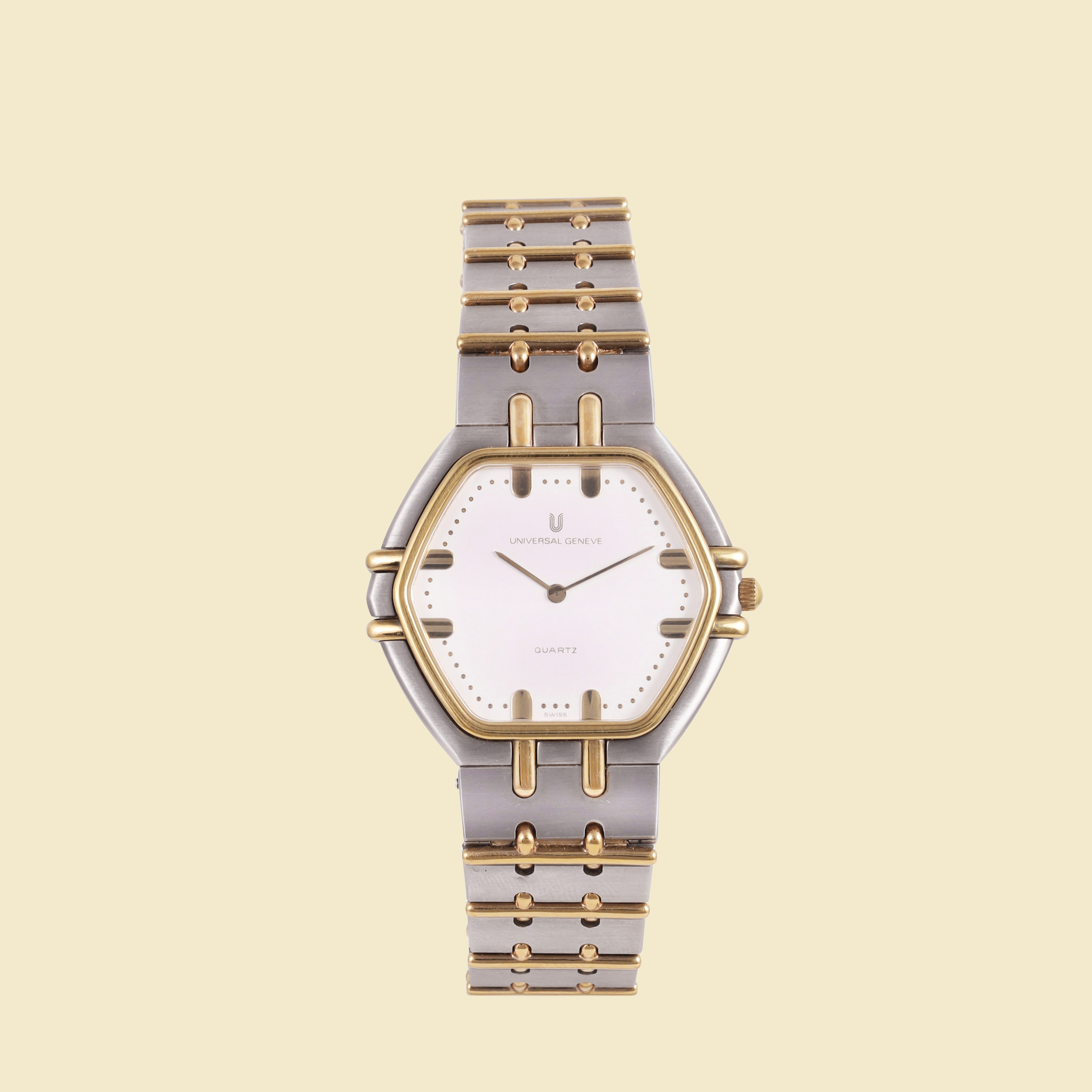 Cassa: in acciaio e oro, esagonale, fondello serrato da viti. Vetro zaffiro