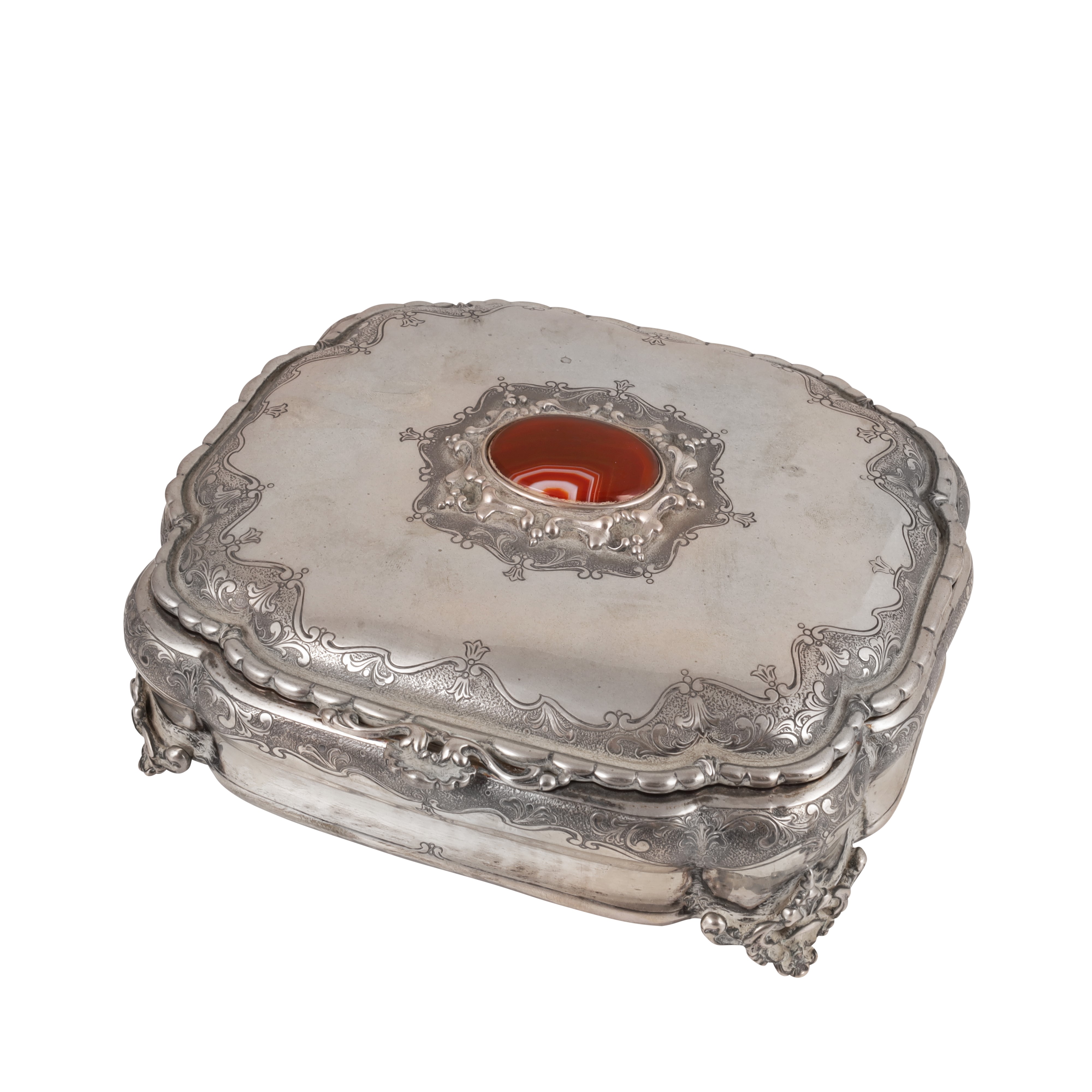 in argento, corpo polilobato su piedini a ricciolo, fasce incise con decori fogliati e coperchio ornato al centro da un'agata ovale, interno vermeille, gr. 850 ca.
