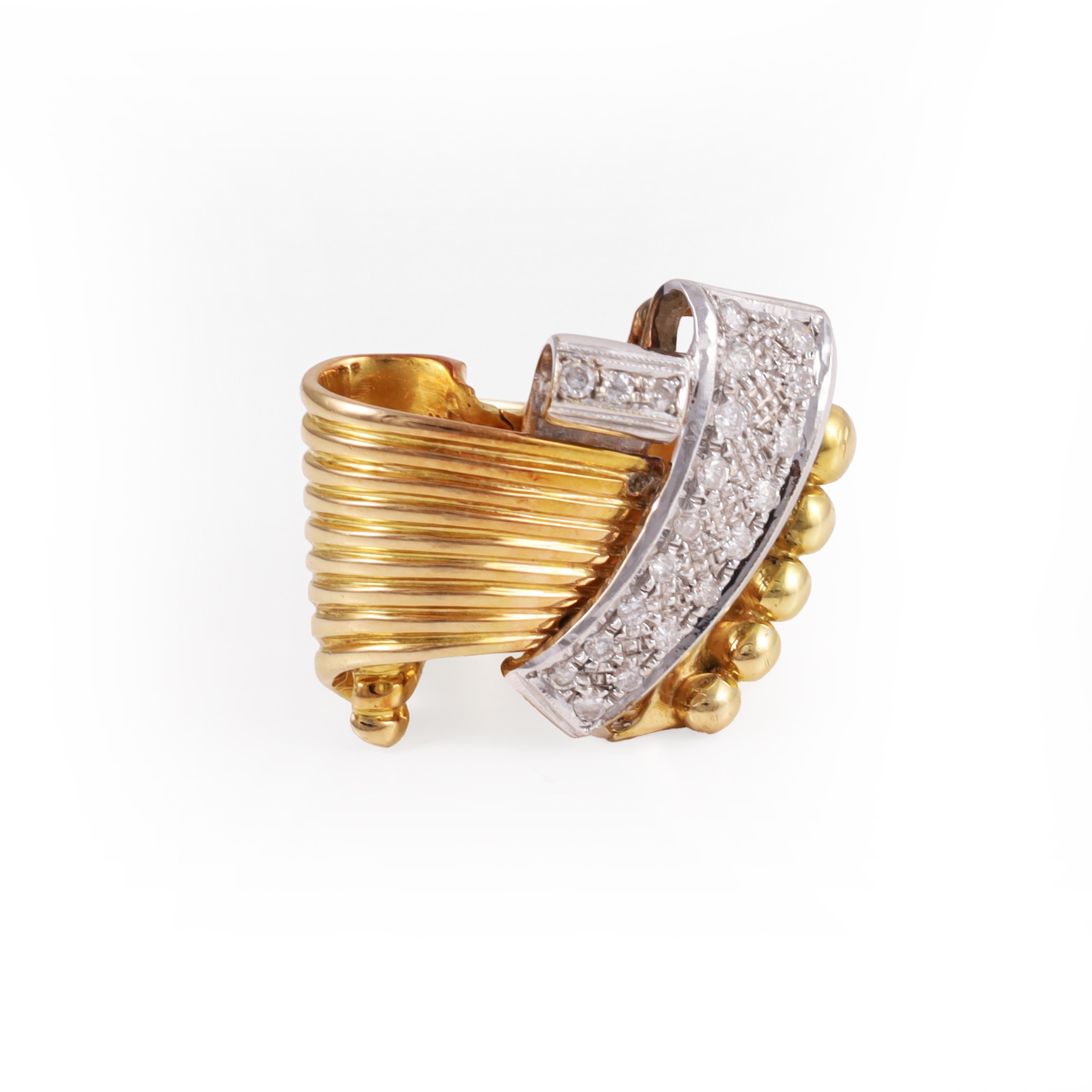 a fascia costolata in oro giallo e motivo superiore in oro bianco ornato da brillanti, gr. 14,4.