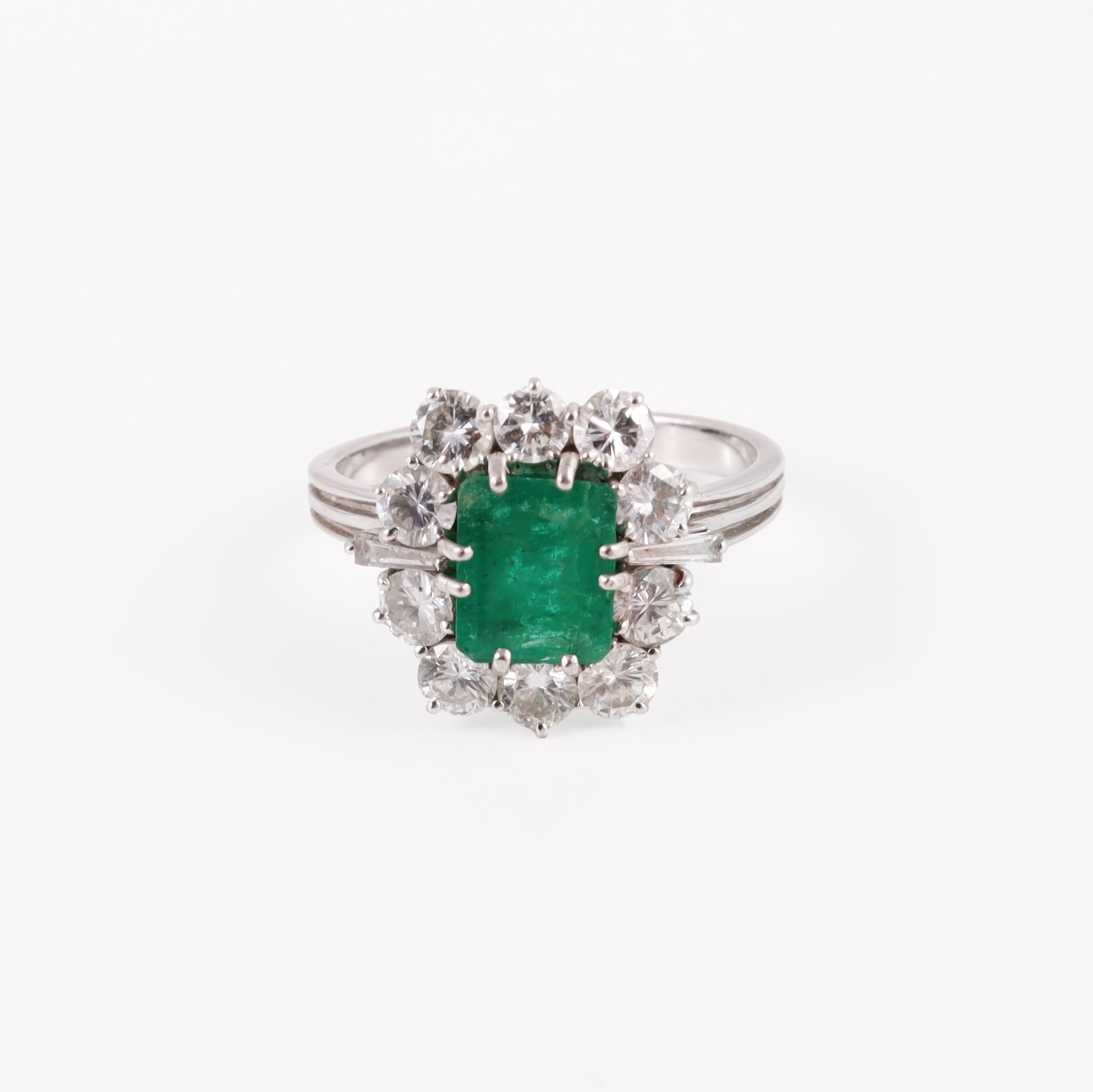 in oro bianco, ornato da uno smeraldo rettangolare, brillanti e diamanti taglio taper, gr. 4,4.