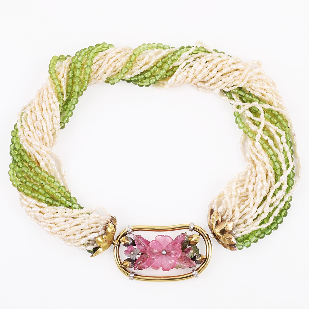 torchon a quattro fili di peridoti e ventitré fili di perle d'acqua dolce con fermezza anteriore in oro ornata da fiori di tormalina e piccoli brillanti, gr. complessivi 137 ca.