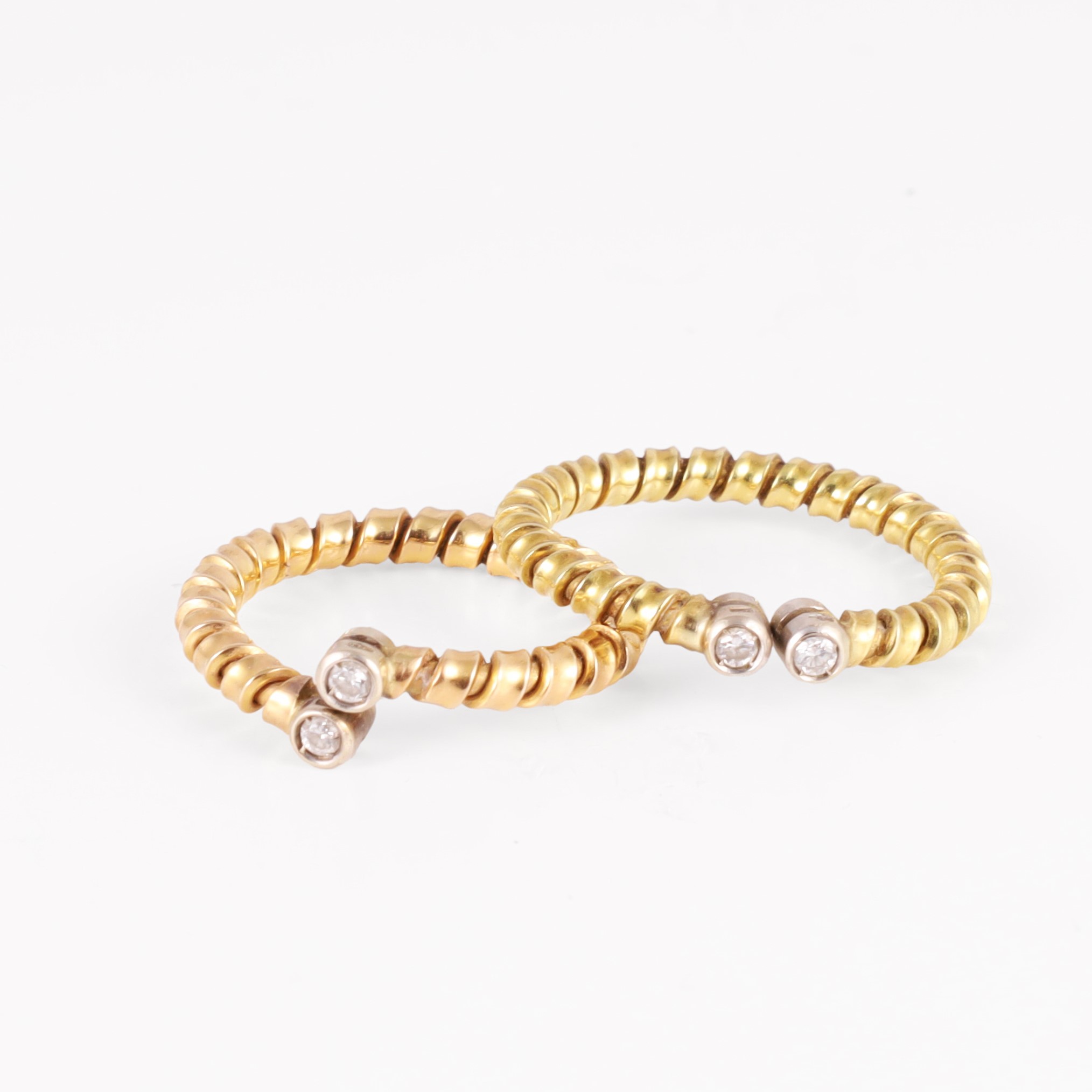 contrarié con gambo semirigido, rispettivamente in oro rosa e oro giallo con brillanti incastonati in oro bianco, gr. complessivi 7,2.