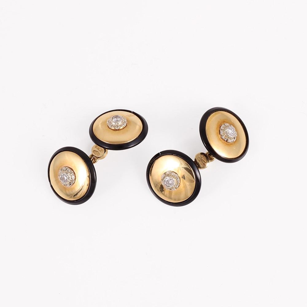 in oro giallo e bianco con dischi in onice e piccoli brillanti, gr. 10.