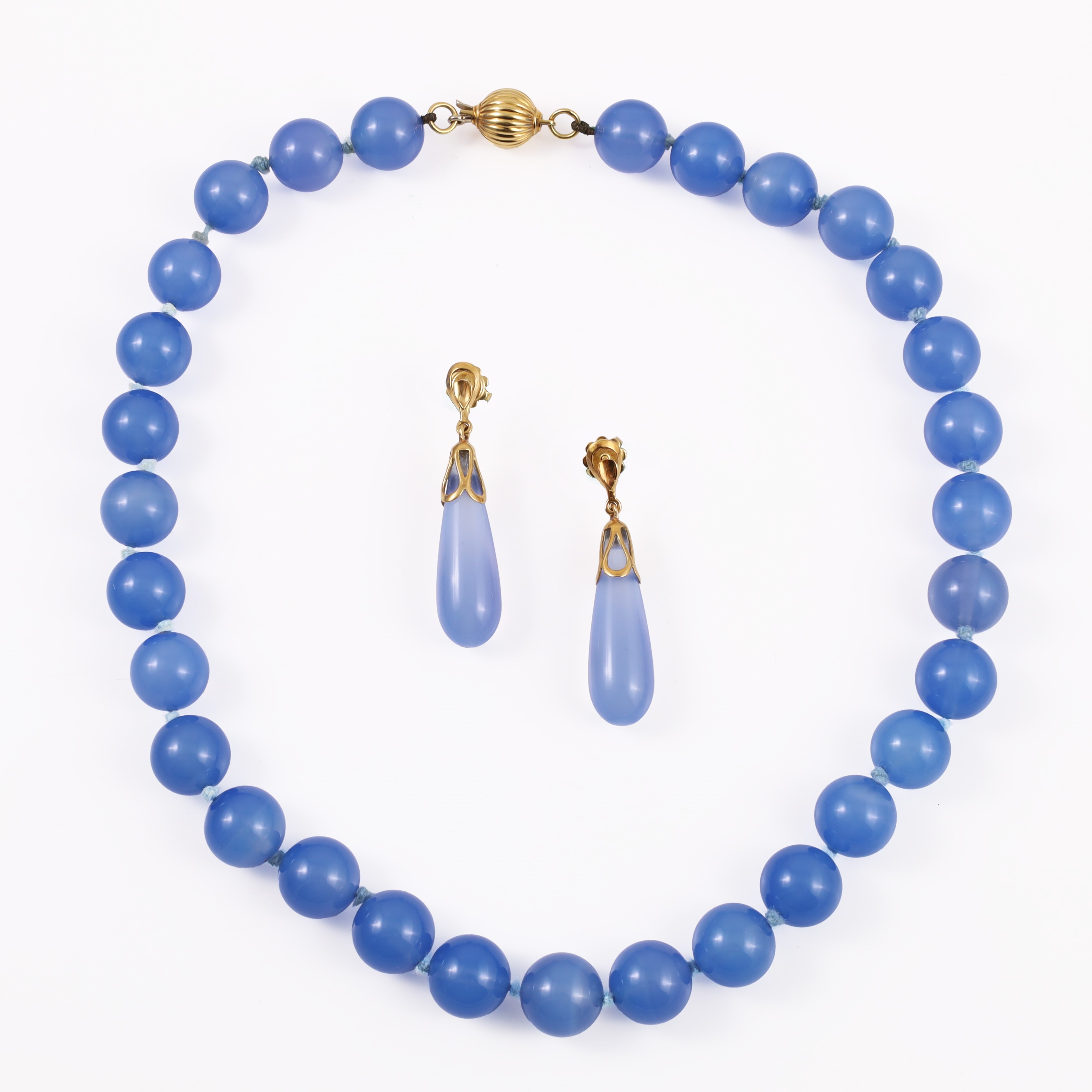 composto da una collana a un filo di sfere di calcedonio con chiusura in oro giallo e un paio di orecchini pendenti in oro giallo con calcedoni a goccia.