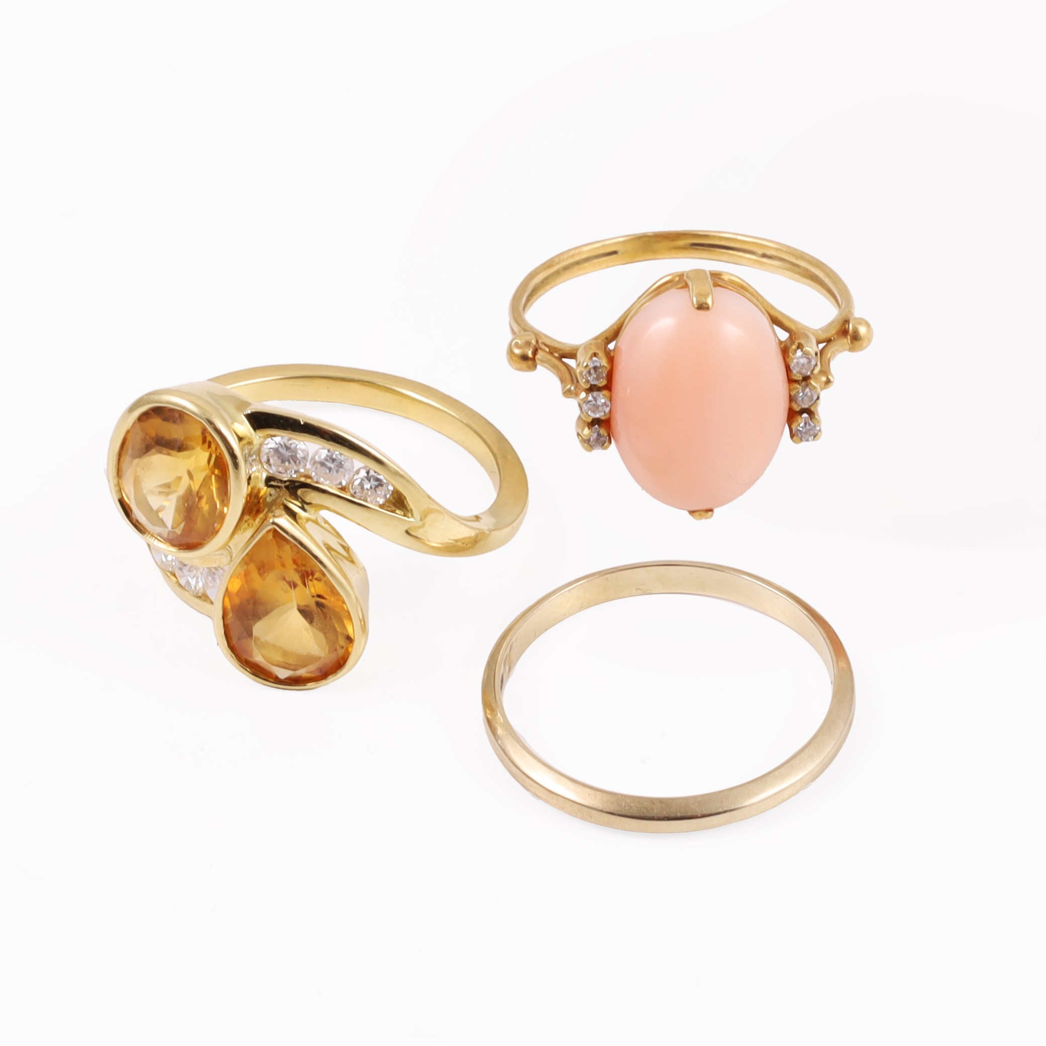 in oro, composto da due anelli con quarzi e corallo taglio cabochon impreziositi da brillanti e una fede, gr. complessivi 9,4.