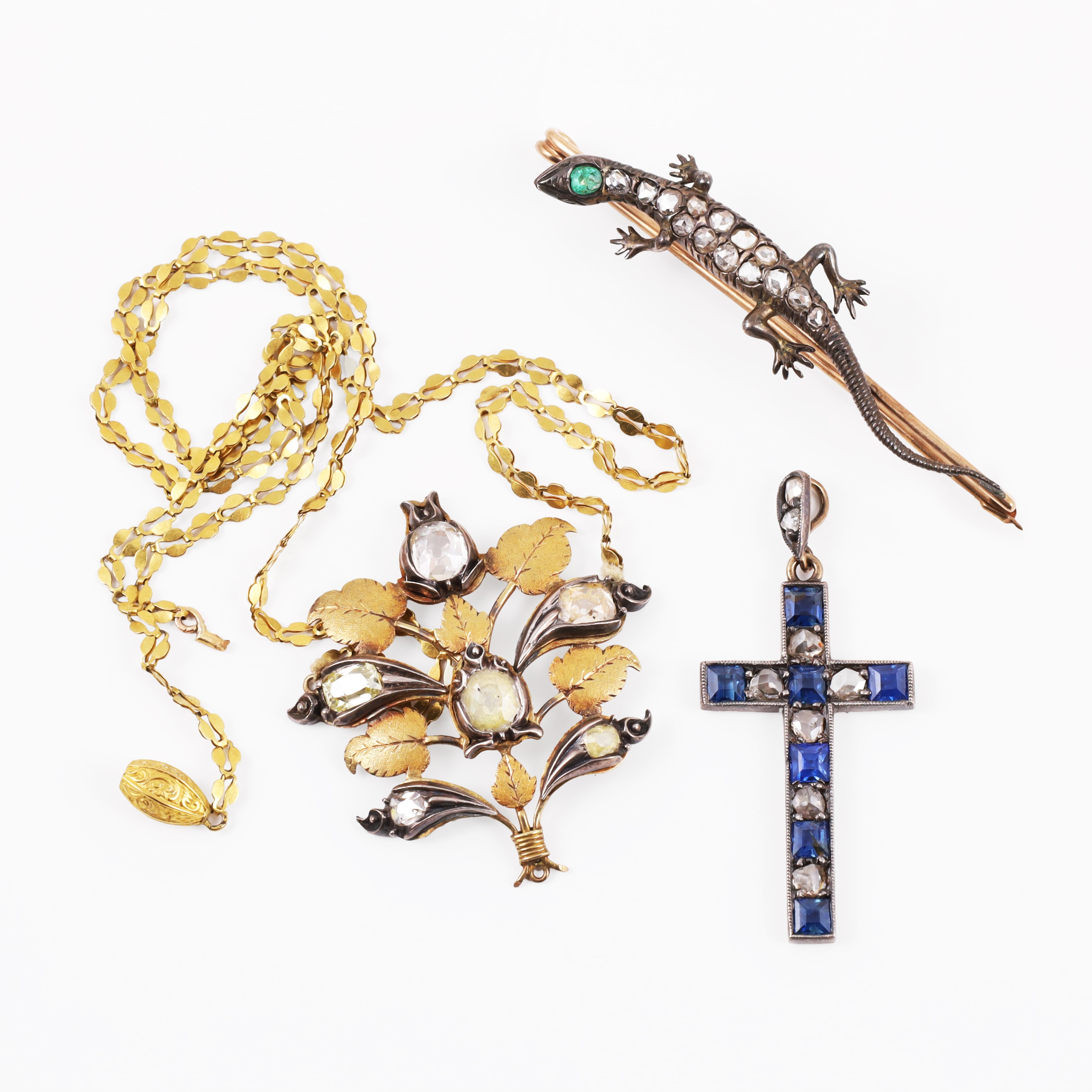 in oro e argento. Composto da collana con motivo centrale fogliato ornato da diamanti e doppiette di diamante con pasta vitrea, spilla a guisa di lucertola con diamanti a rosa e piccolo smeraldo e pendente a croce con zaffiri e diamanti taglio a rosa, gr. complessivi 13,5.