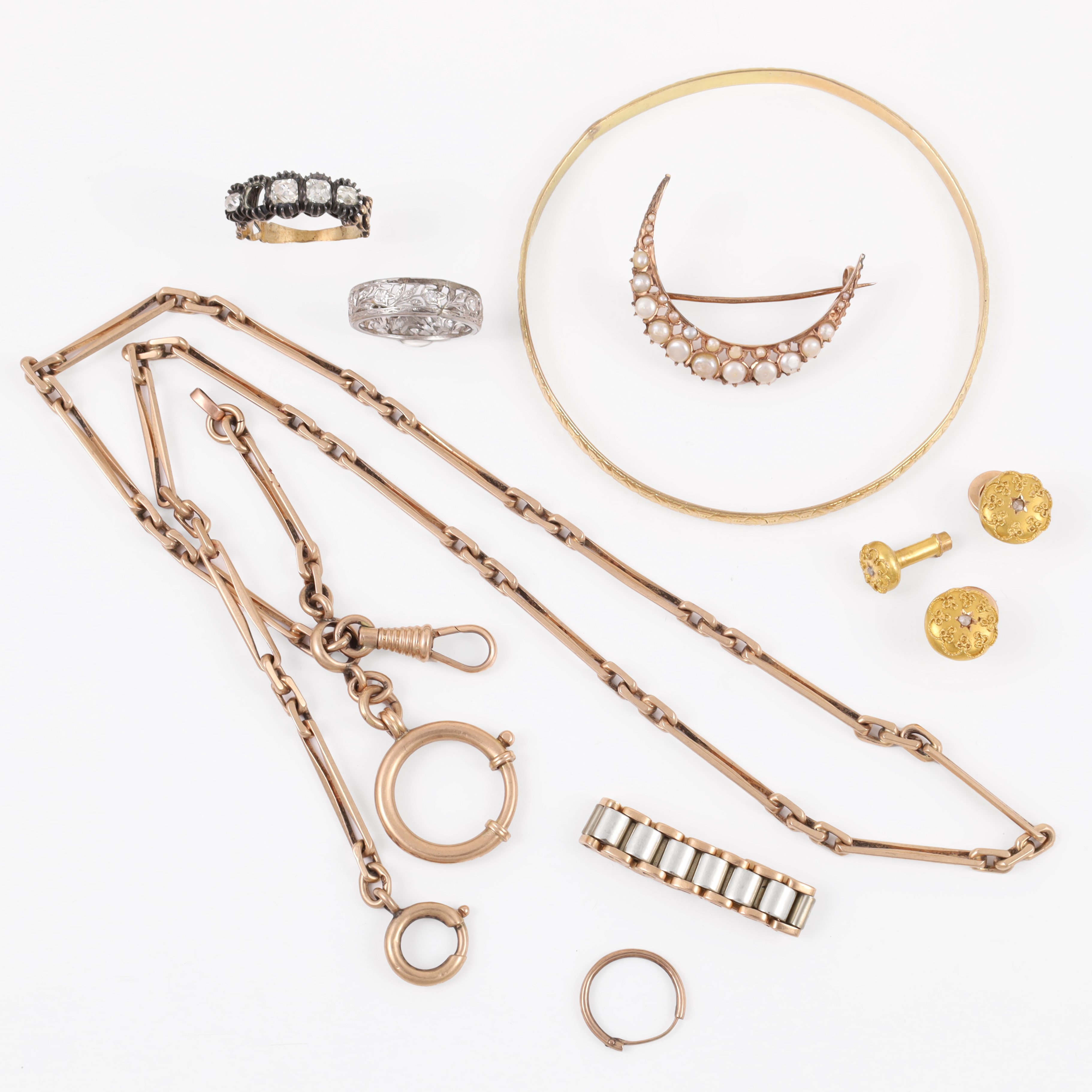 composto da due anelli, un paio di gemelli, un bottone da sparato e una spilla in oro e un anello in argento e oro con diamanti (uno mancante), gr. complessivi 21,2. Una catena per orologio in oro 9KT, gr. 26,5.