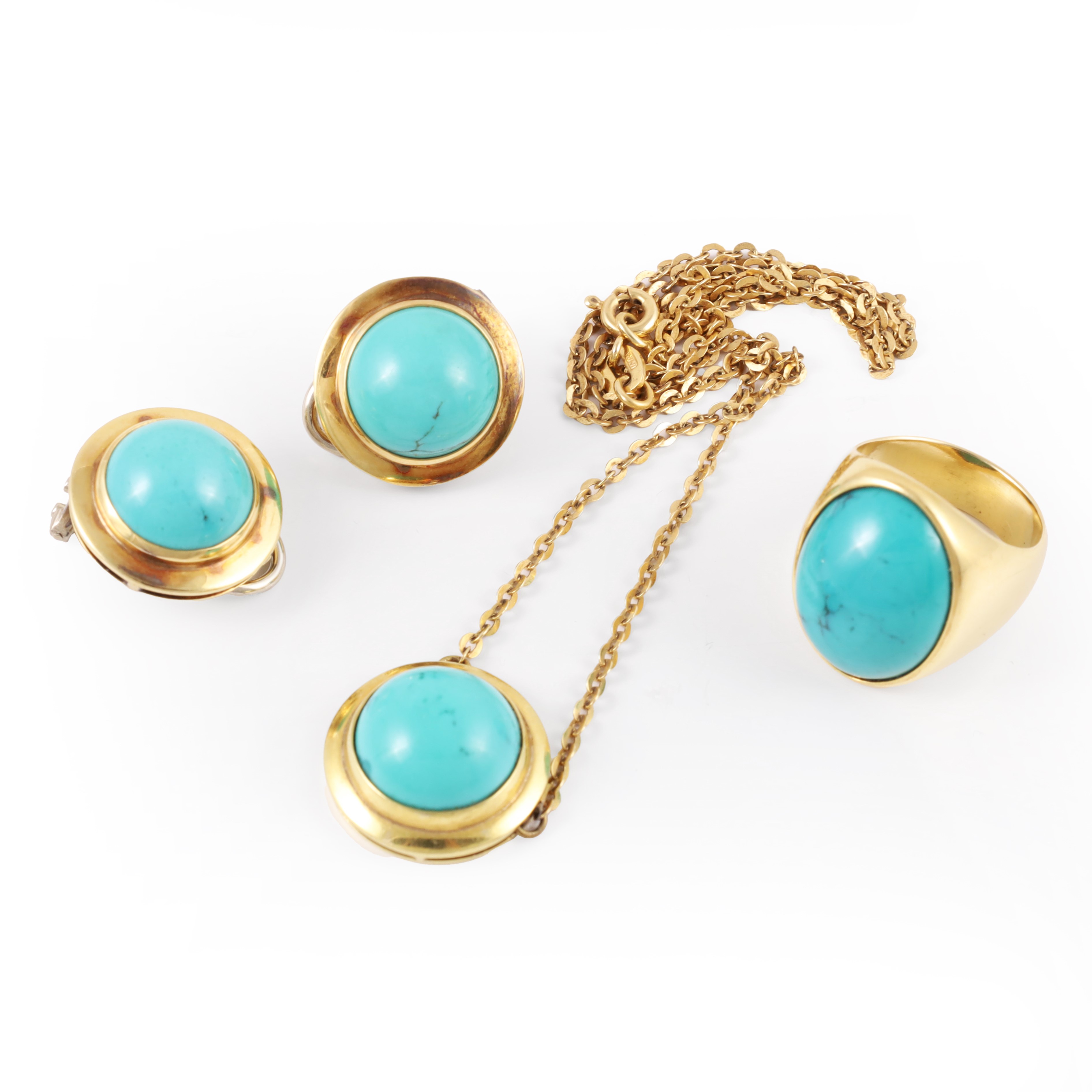 in oro giallo e turchesi, composto da parure di girocollo e orecchini a clip e anello, gr. complessivi 36,5.
