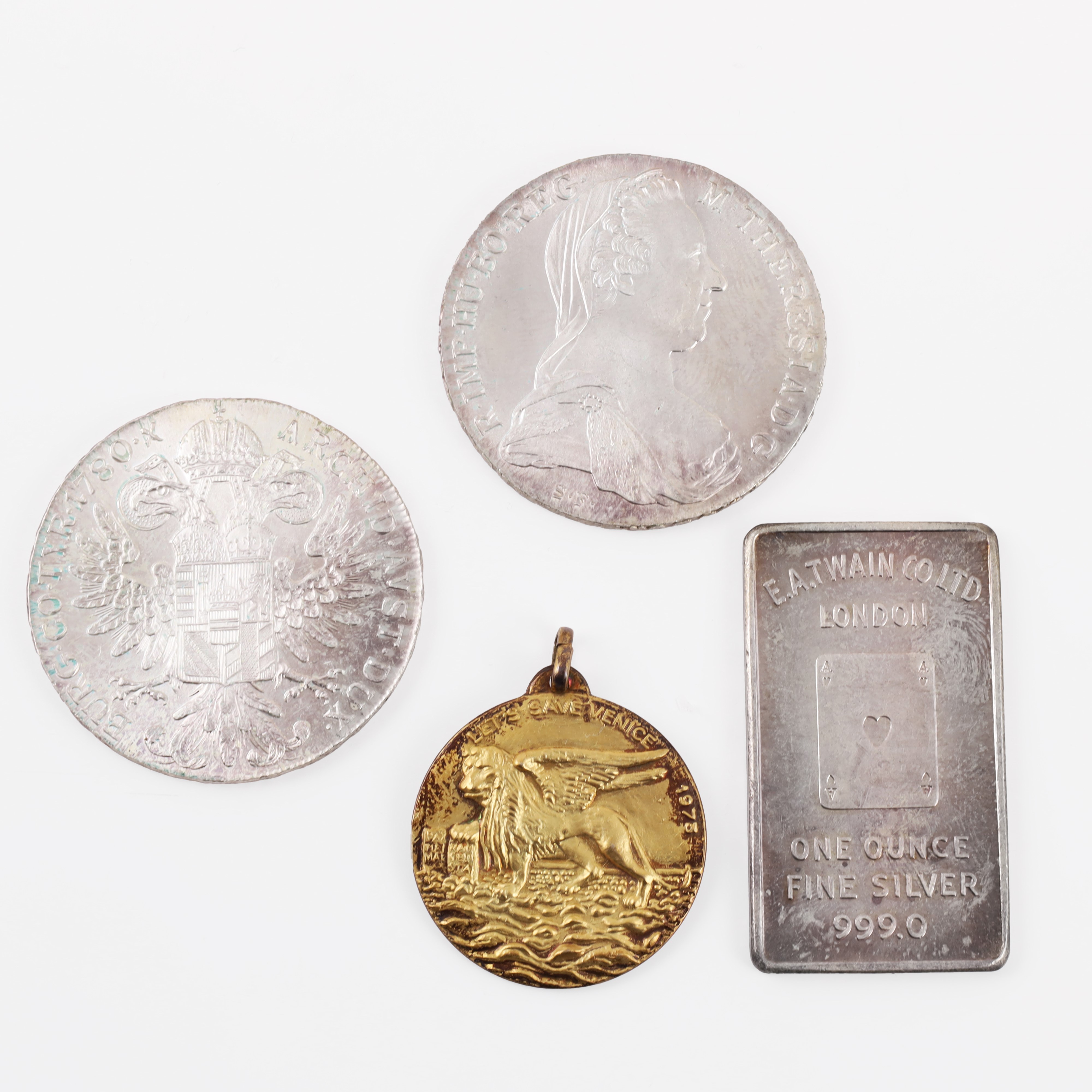 composto da due Talleri Maria Teresa d'Austria e una medaglia vermeil e smalto marcata Lions in argento 800/1000 del peso complessivo di gr. 68,4 e un lingotto marcato E.A. Twain Co. Ltd. Londra in argento 999/1000, gr. 31,3.
