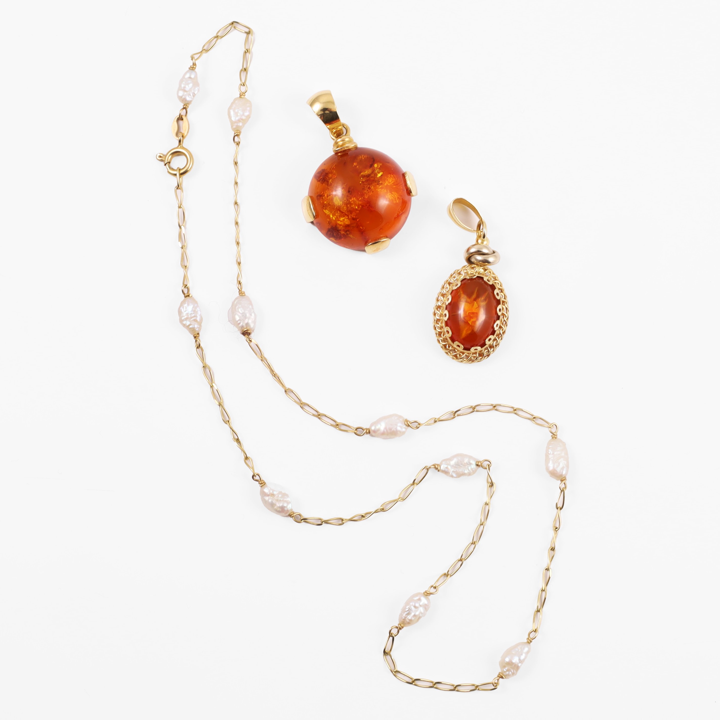 composto da due pendenti in oro con ambra e una catenina in oro con perle d'acqua dolce, gr. complessivi 12,1.