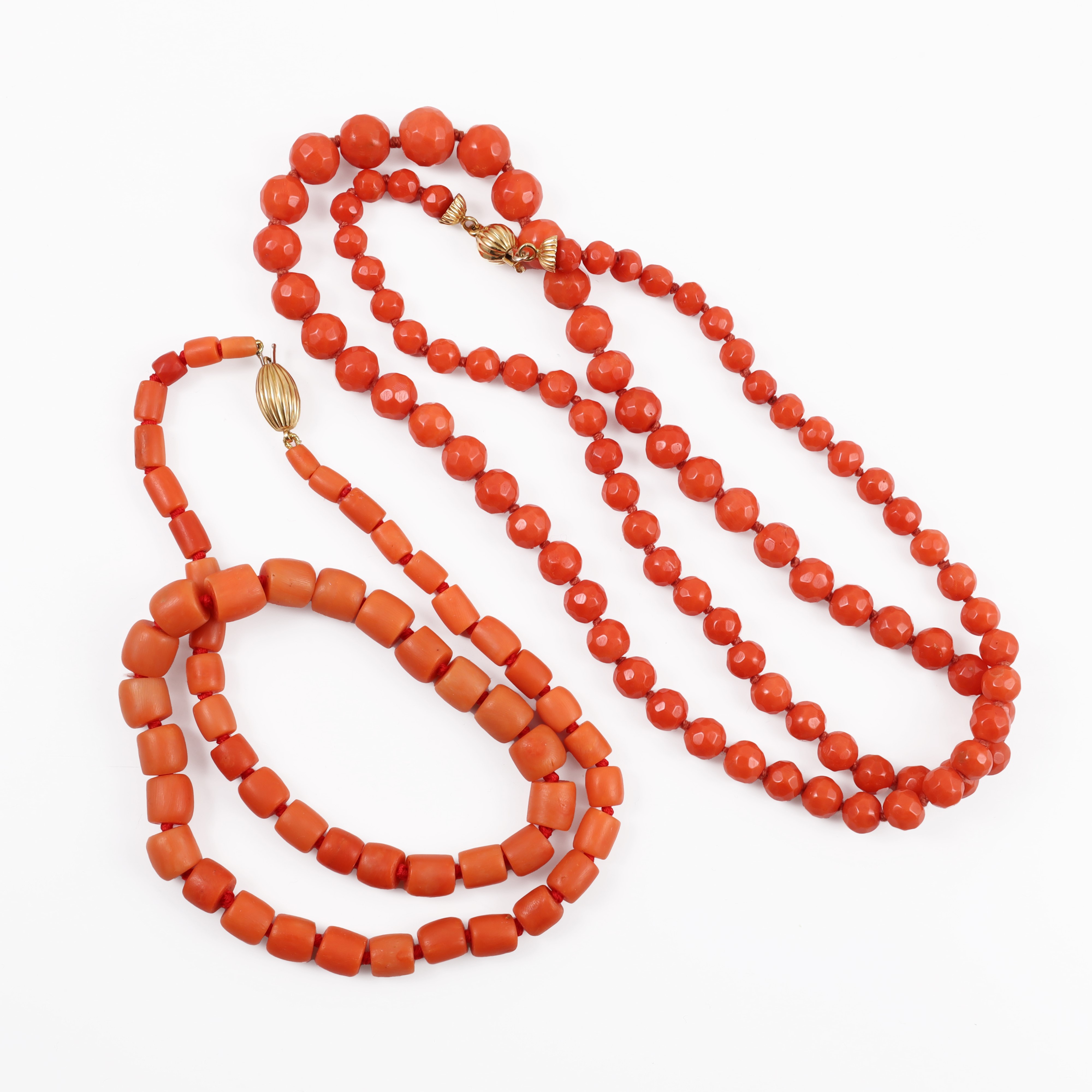 composto da due collane a un filo di corallo con chiusure in oro, gr. complessivi 104,3.