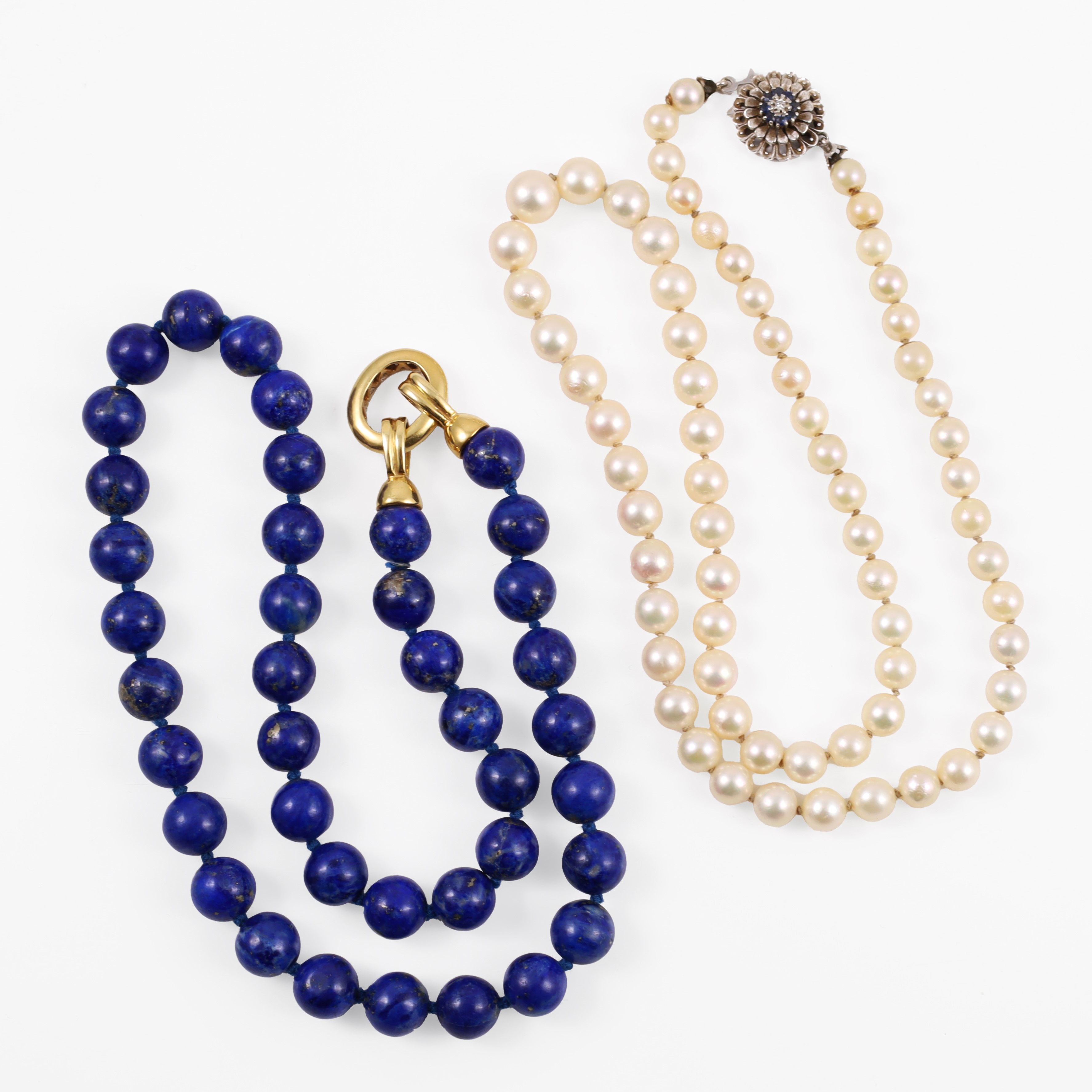 composto da due collane rispettivamente con perle coltivate e sfere di lapislazzuli, chiusure in oro.