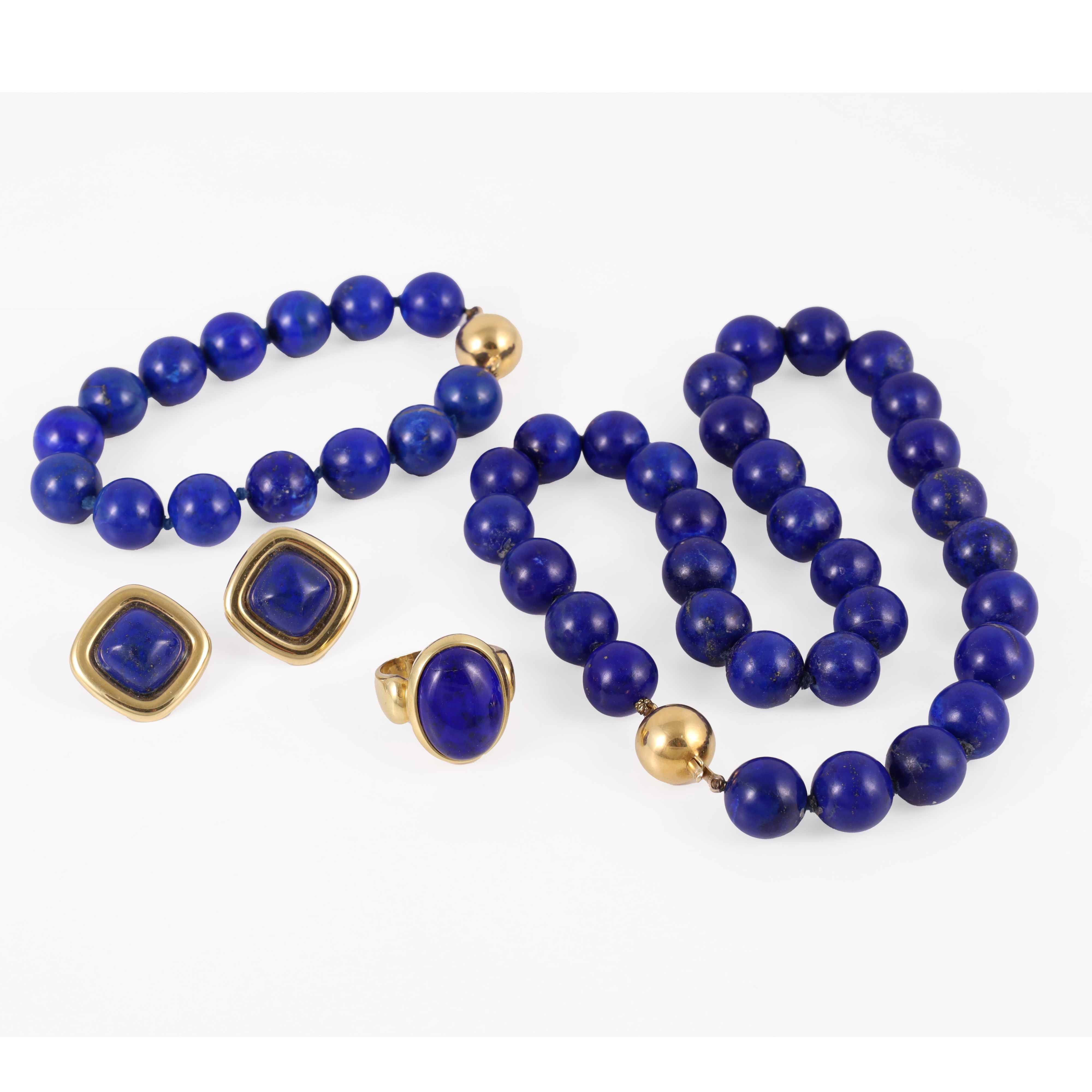 composto da collana e bracciale a un filo di sfere di lapislazzuli con chiusure in oro giallo, anello e orecchini in oro giallo con lapislazzuli taglio cabochon, gr. 21,3.