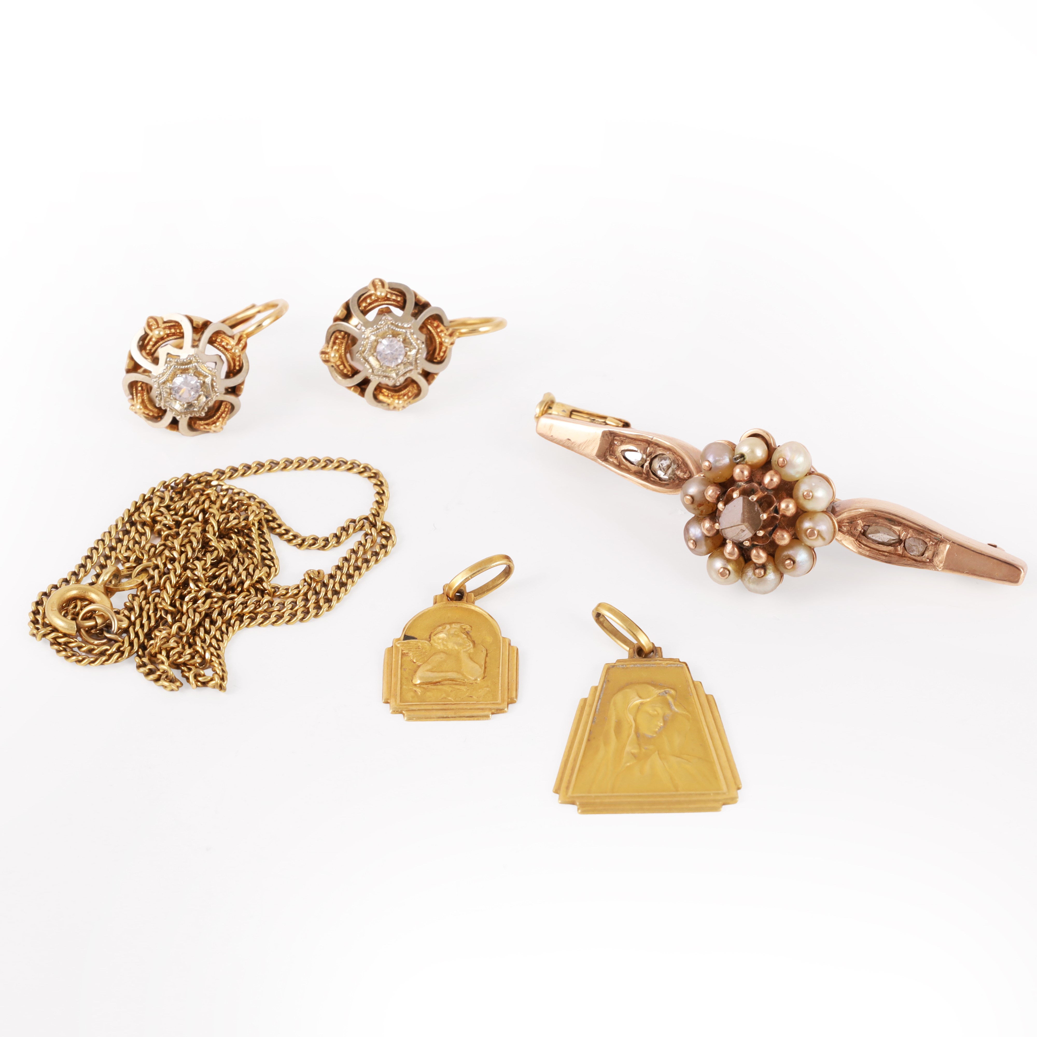 in oro, composto da un paio di orecchini con pietre sintetiche, due medagliette e una catena in oro 18KT. Una spilla con piccole perle e diamanti taglio a rosa in oro 9KT, gr. complessivi 21.