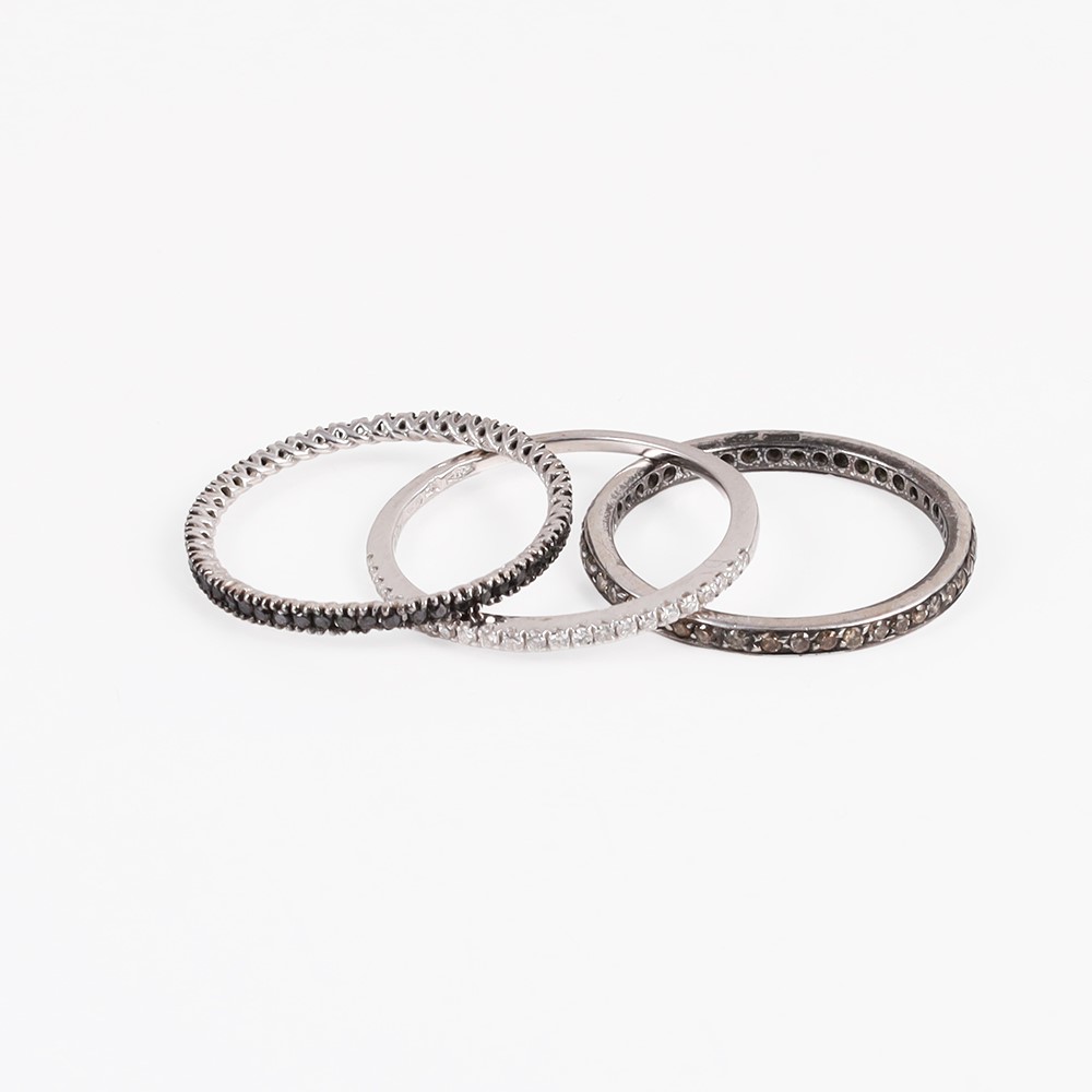 composto da tre fedine: una in oro bianco ornata anteriormente da brillanti incolori e due a tutto giro in oro bianco con brillanti neri e in oro brunito con brillanti "brown", gr. complessivi 3,7.