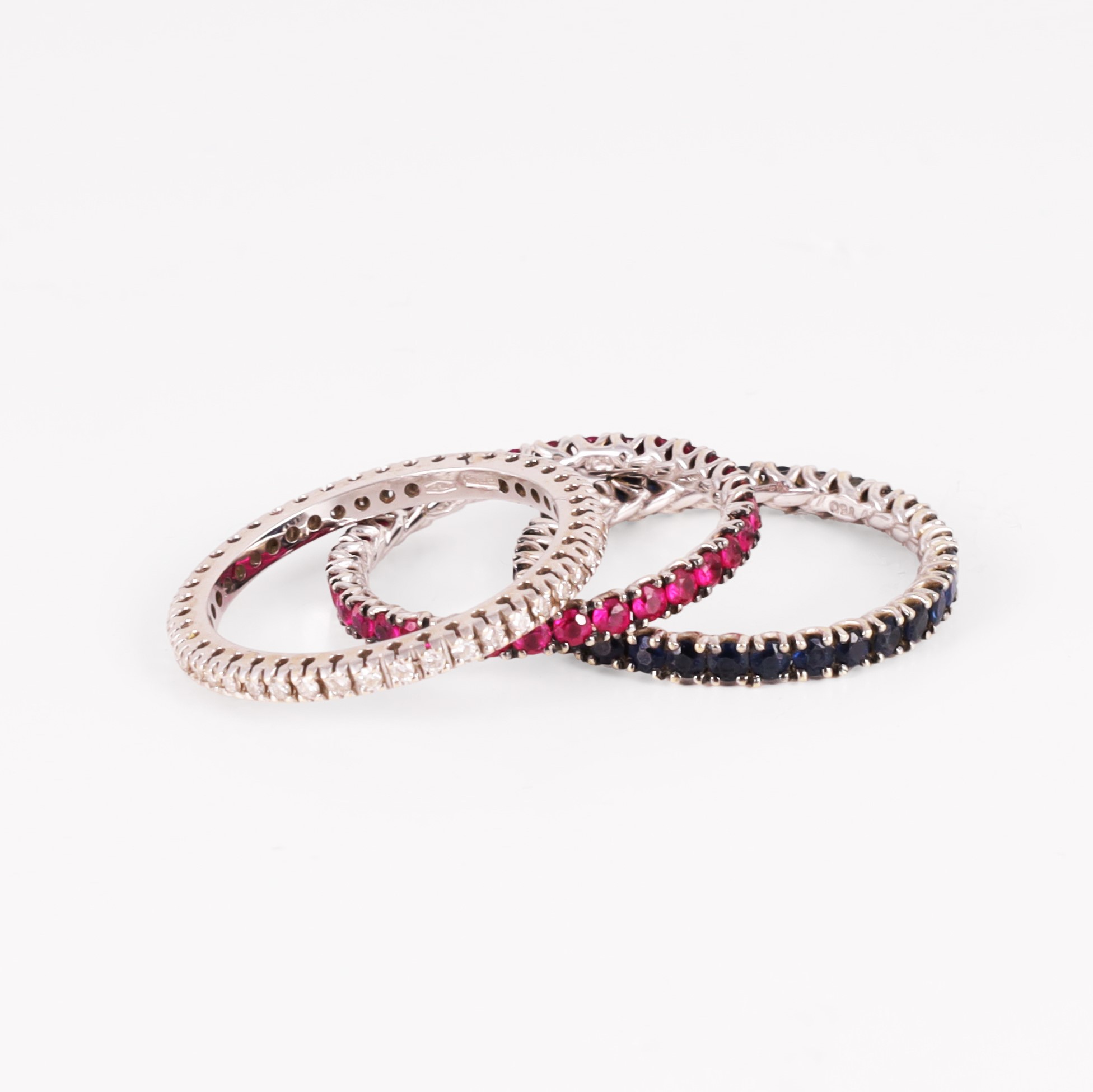 composto da tre rivière in oro bianco percorse da brillanti, rubini e zaffiri, gr. complessivi 5,5.