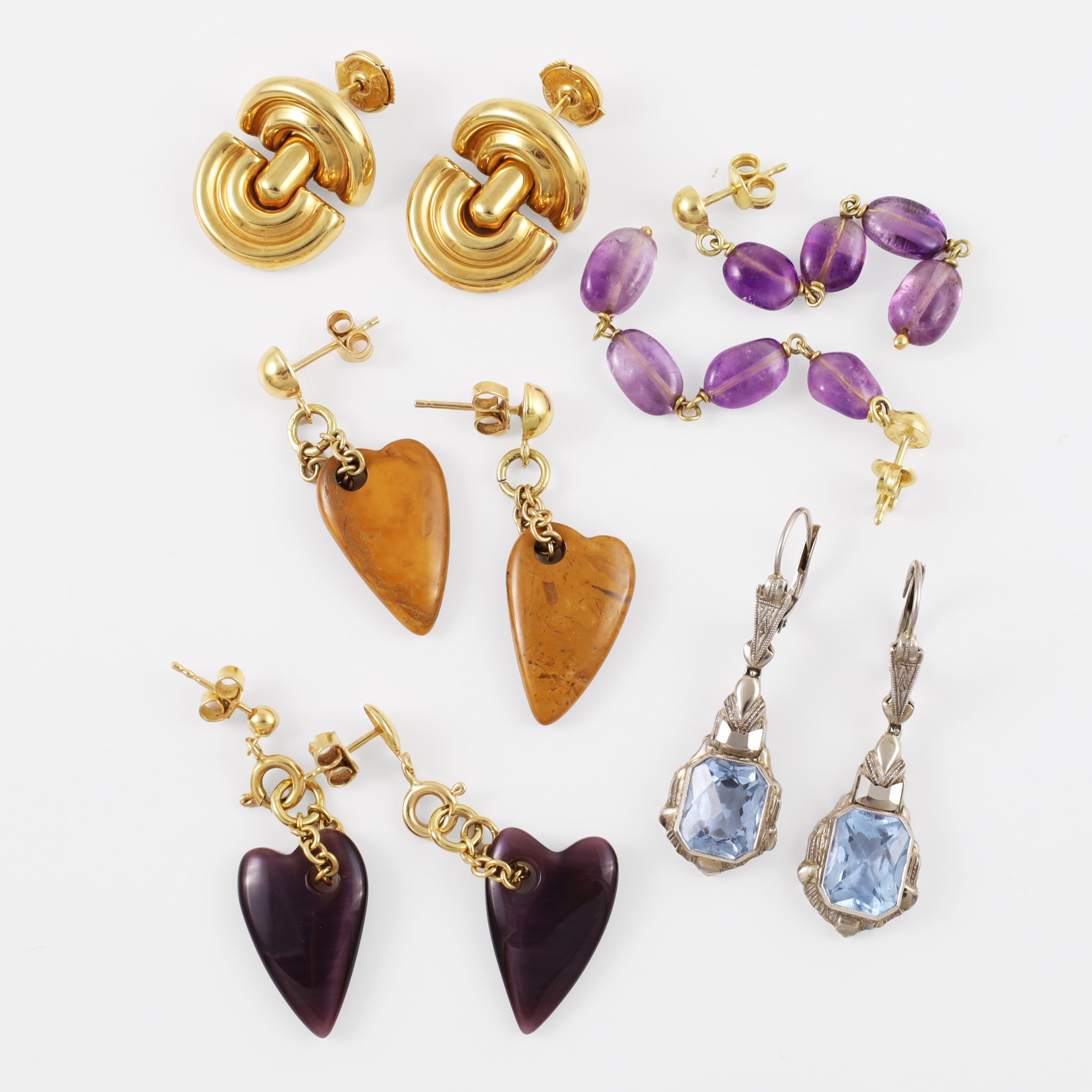 composto da cinque paia di orecchini in oro a diverse fogge con diaspri, ametiste e pietre sintetiche, gr. complessivi 30,6.