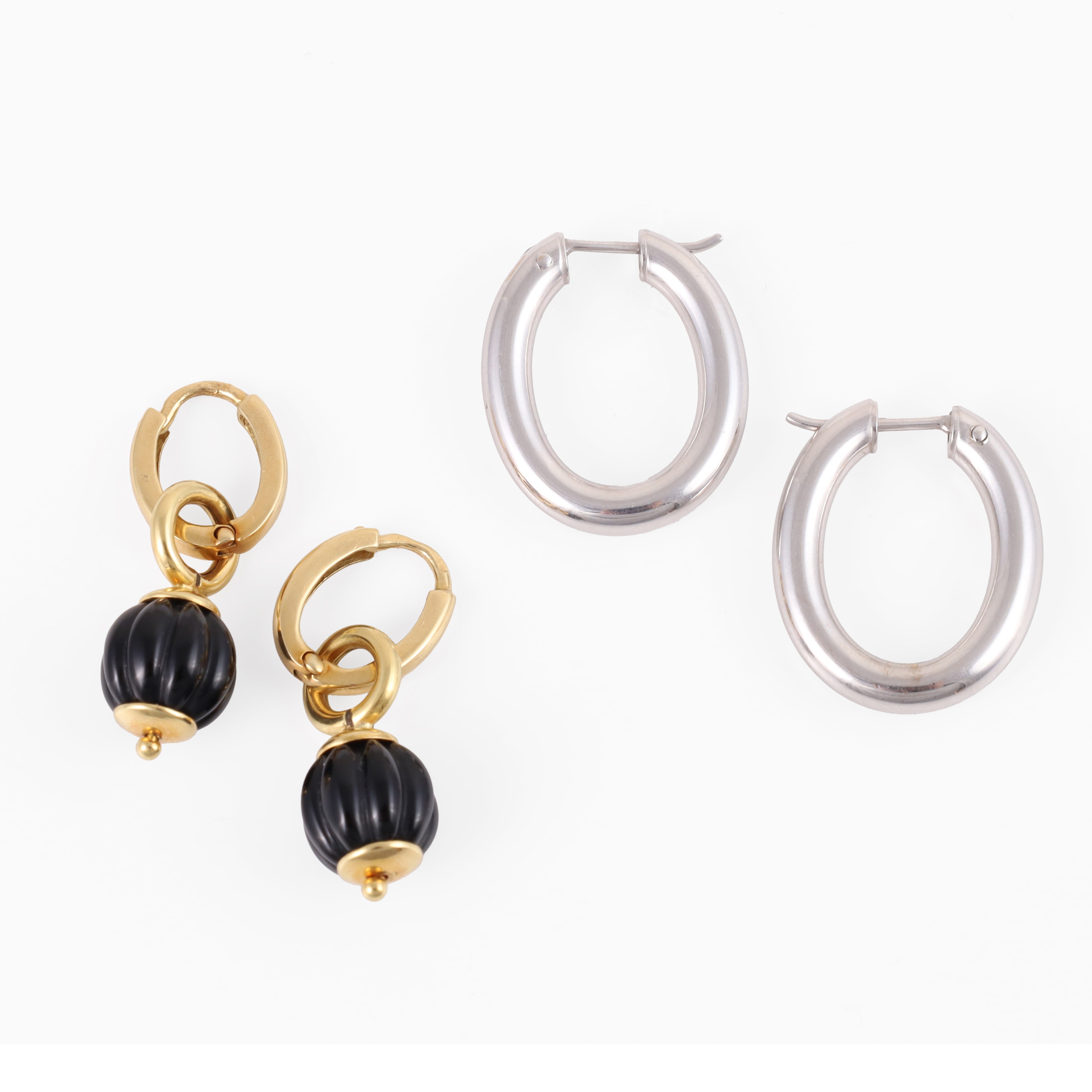 composto da due paia di orecchini, rispettivamente in oro bianco a forma ovale e in oro giallo con sfere di onice taglio tranche de melon, gr. complessivi 10,1