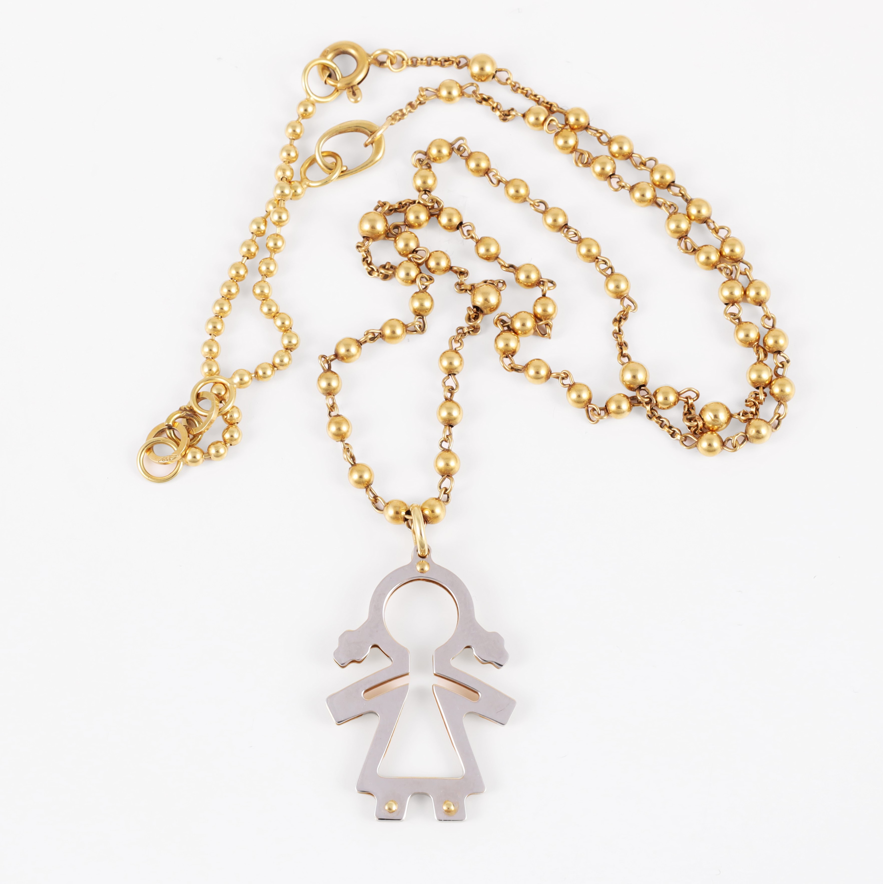 in oro bianco e giallo, composto da un pendente a sagoma di bambina e una catenina a sferette con segmento di maglie aggiuntive, gr. complessivi 9,6.
