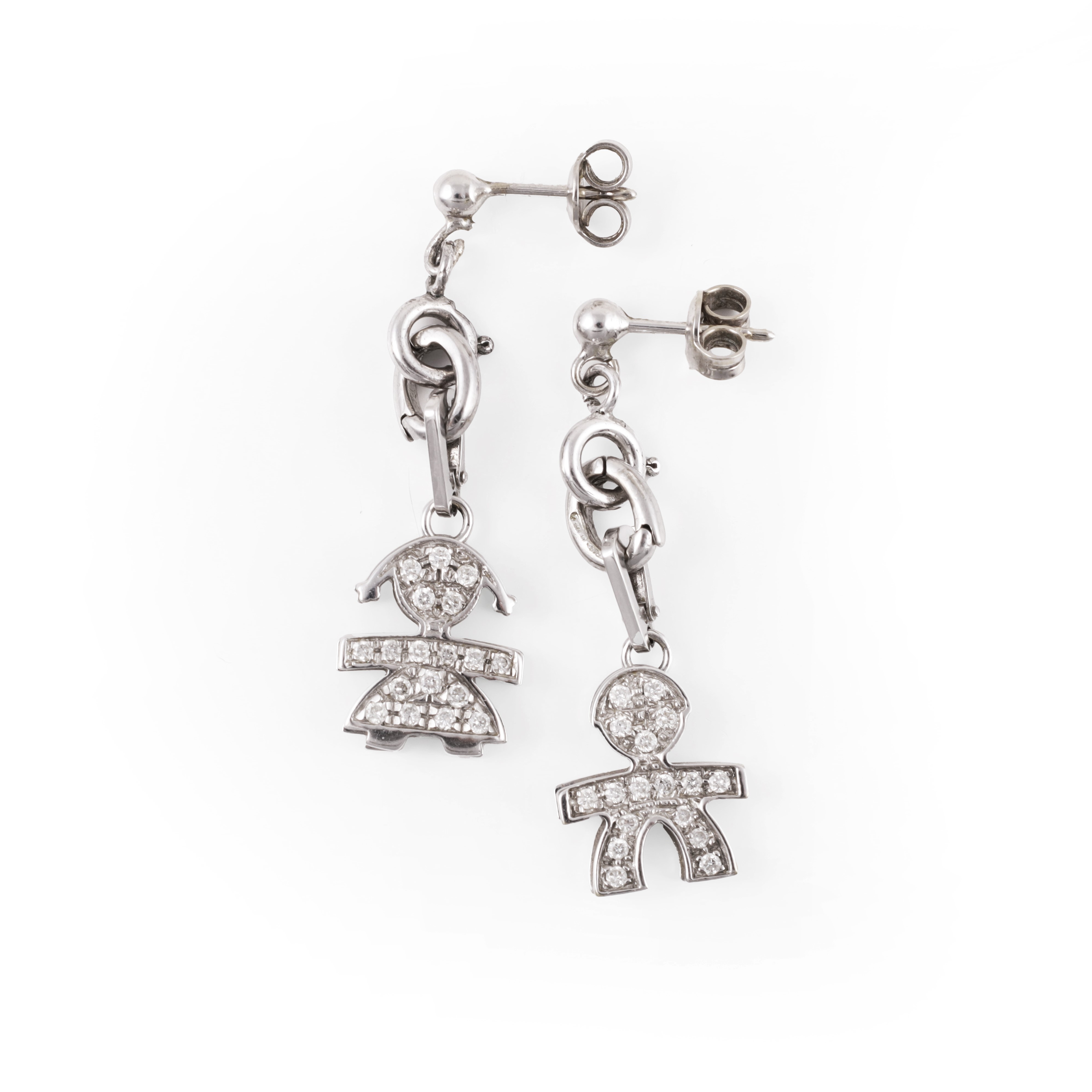 composto da un paio di orecchini con pendenti staccabili raffiguranti una bimba e un bimbo in oro 18KT e brillanti, gr. complessivi 5. Moschettoni di raccordo in oro 9KT e argento 925.