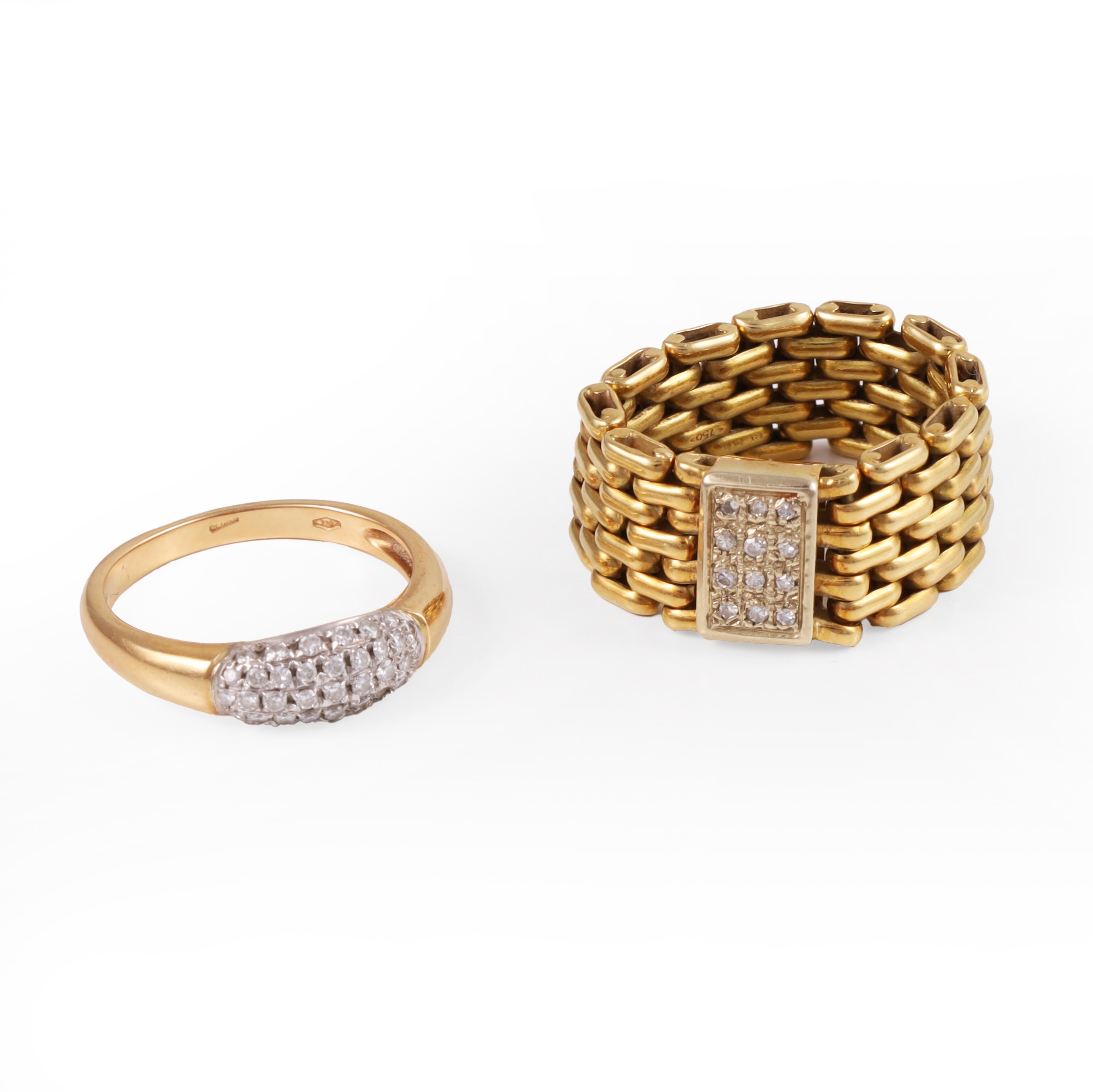 composto da due anelli in oro giallo e bianco, ornati da brillanti, uno dei quali a morbida maglia, gr. complessivi 15,4.