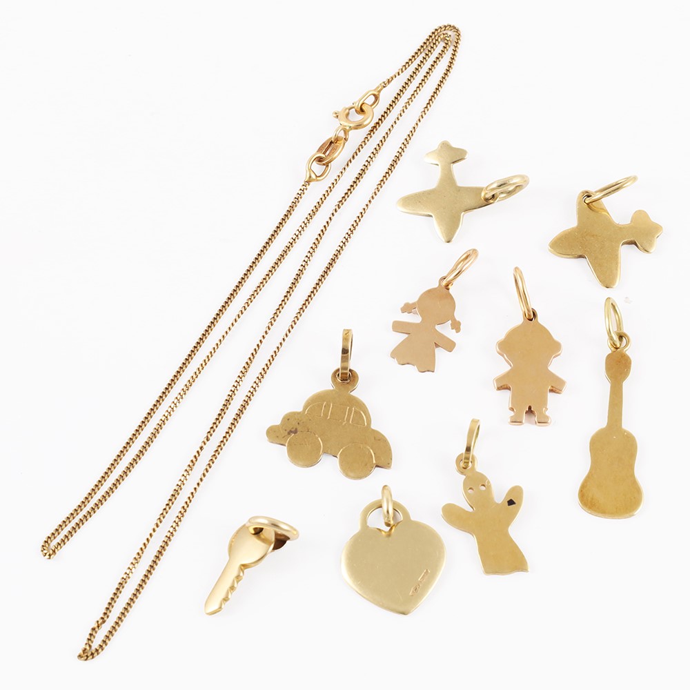 composto da nove pendenti a differenti fogge e una catenina in oro, gr. complessivi 16,2.