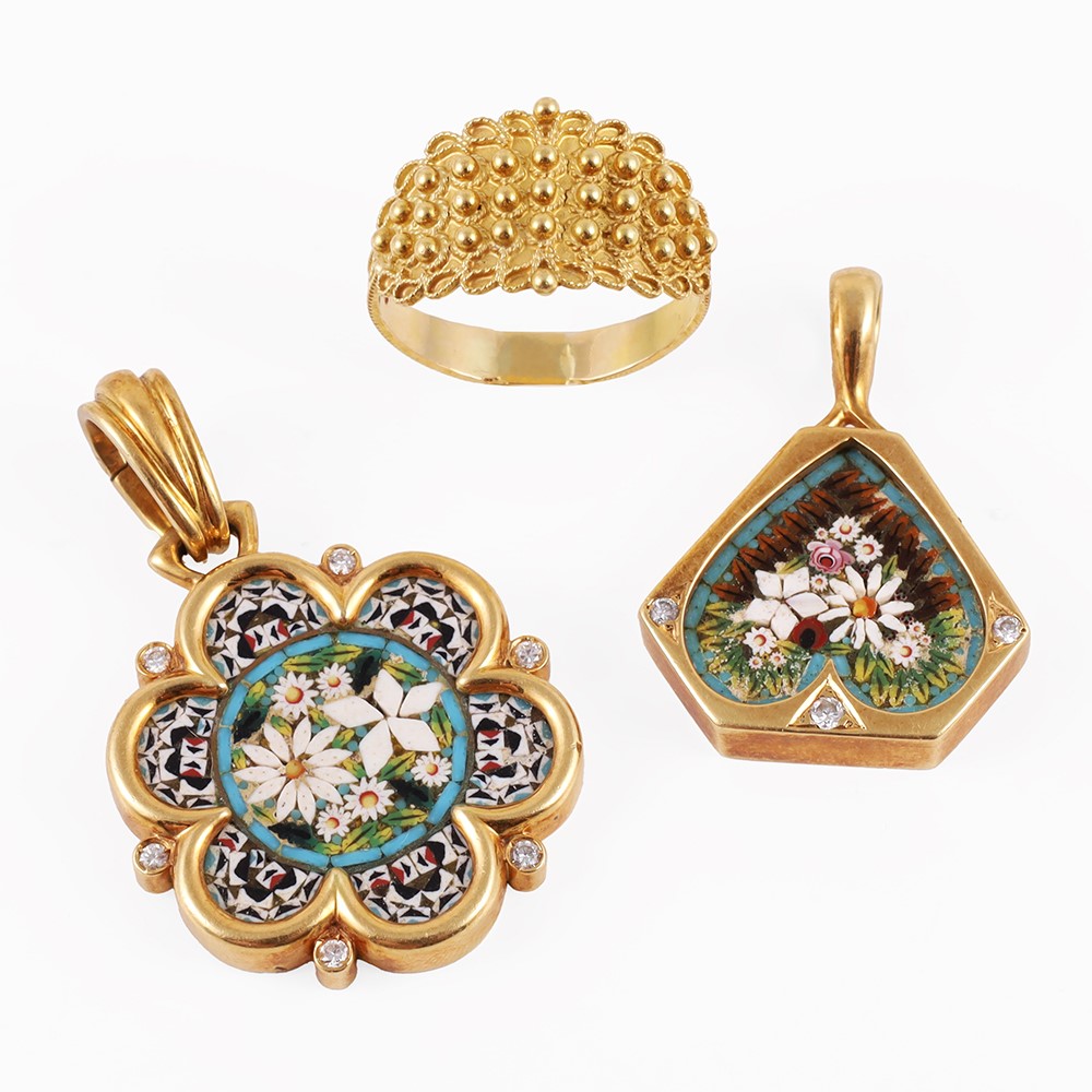 in oro giallo, composto da due pendenti con micromosaici e piccoli brillanti e una fede in filigrana, gr. lordi complessivi 26,8.
