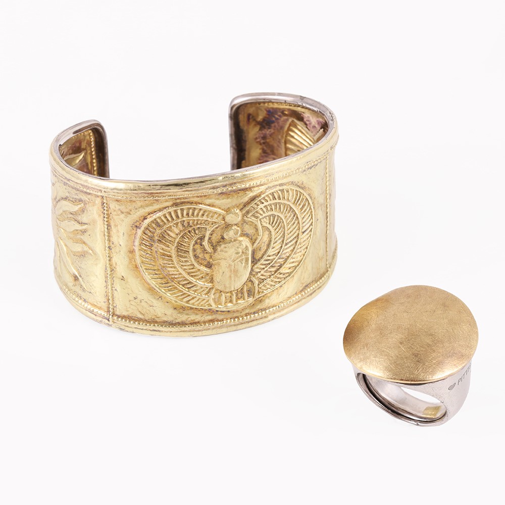 composto da un bracciale alla schiava in oro 18KT e argento con scarabeo a sbalzo (gr. 26,5) e un anello a fascia in argento 925/1000 con motivo circolare placcato oro (gr. 16,4).